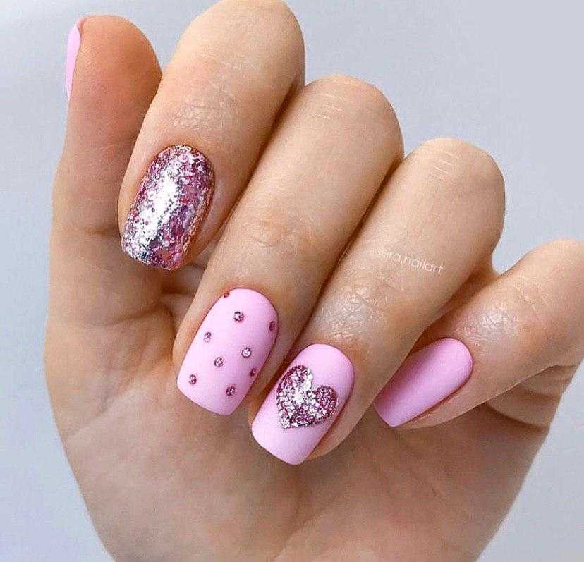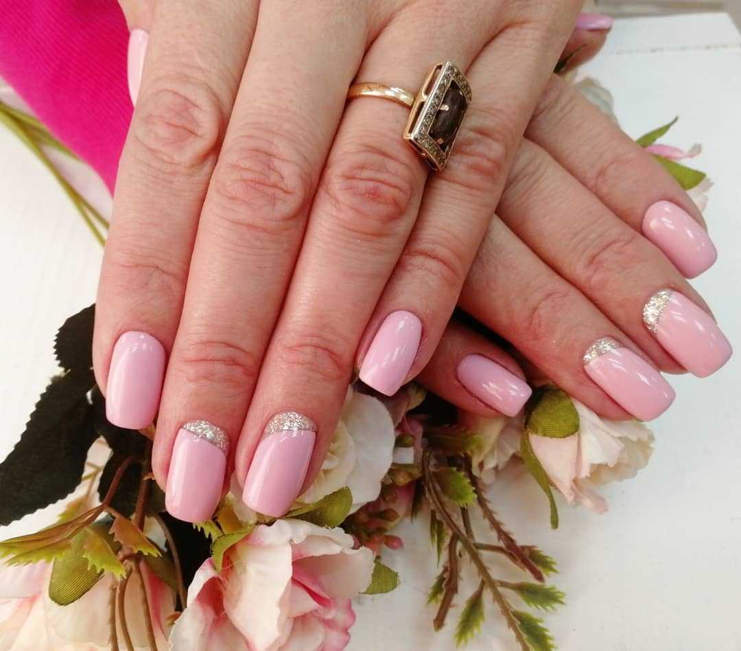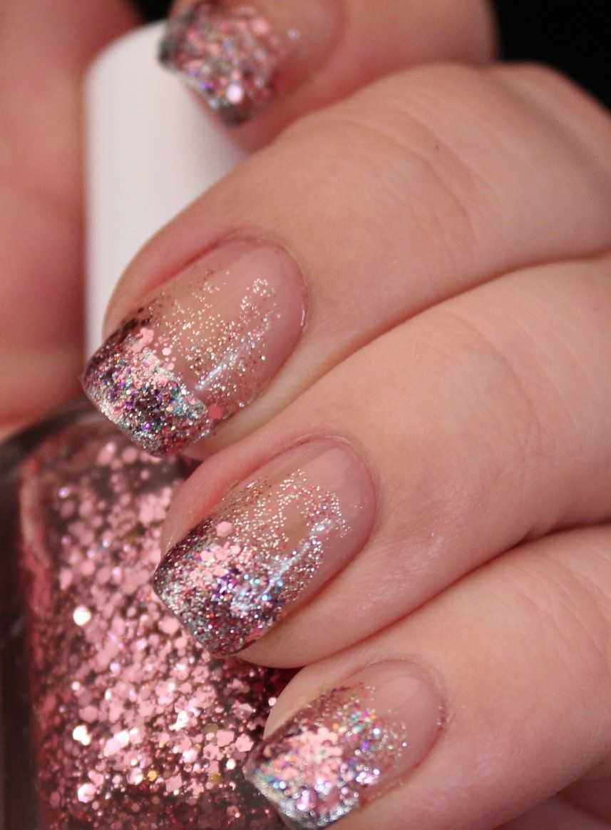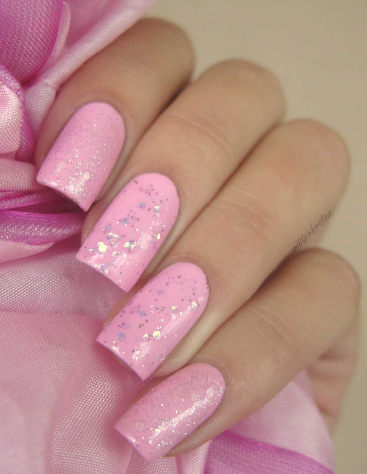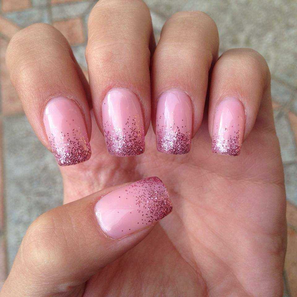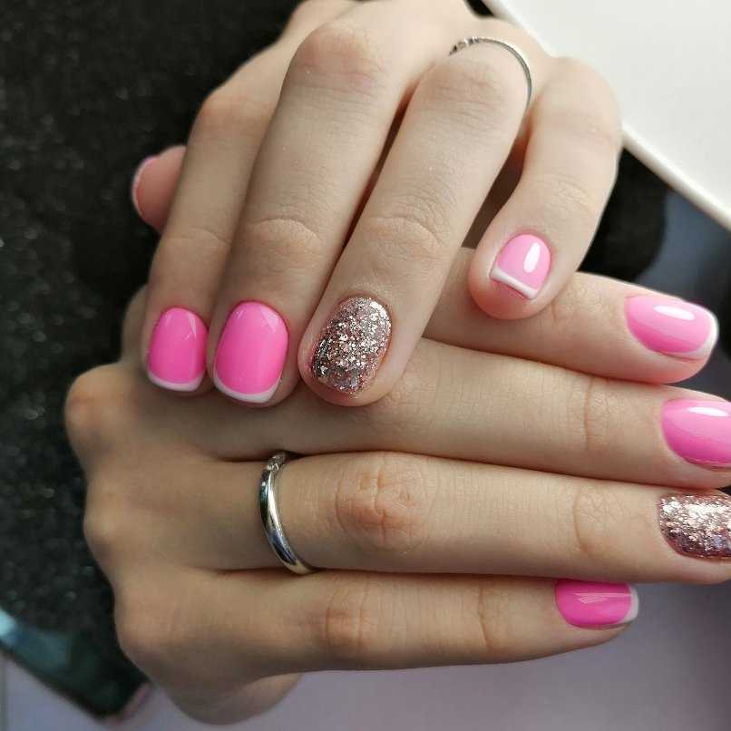 Маникюр с однотонным дизайном розовыми блестками/фольгой всех пальчиков подходит загорелой и бледной коже. А если хотите экспериментов, попробуйте блестками украсить только кончики ногтей, выполнить растяжку или дизайн.