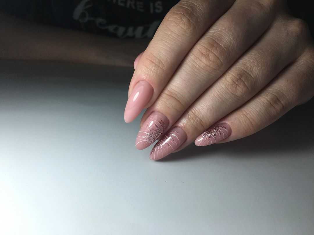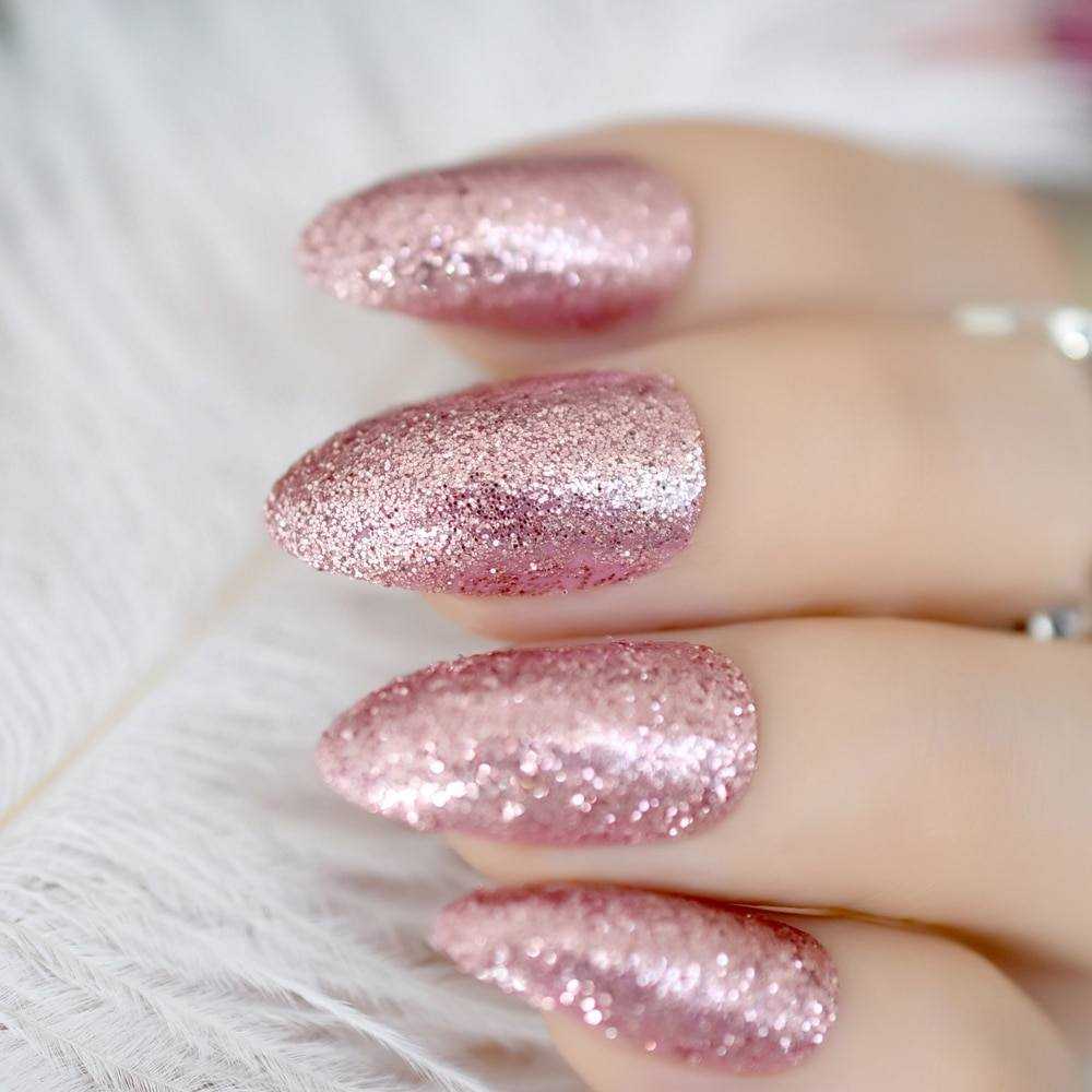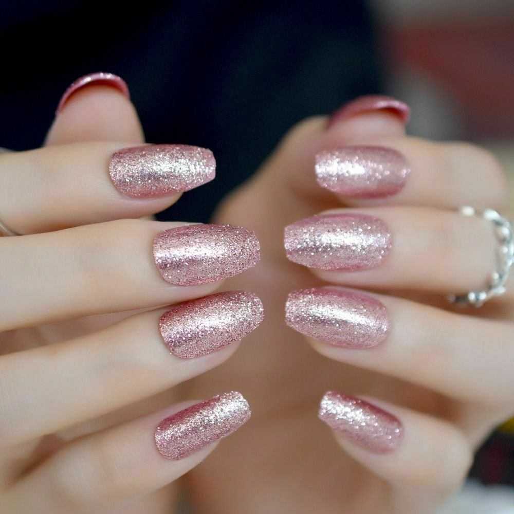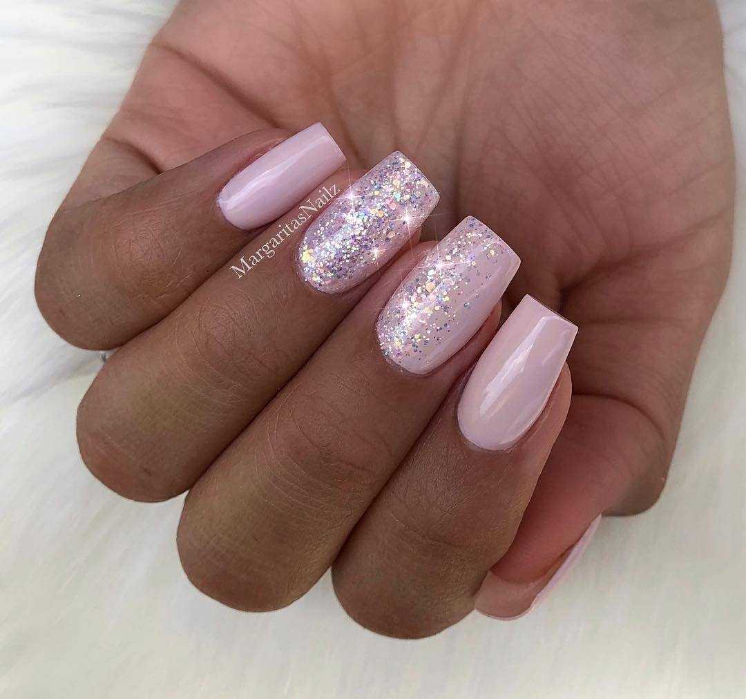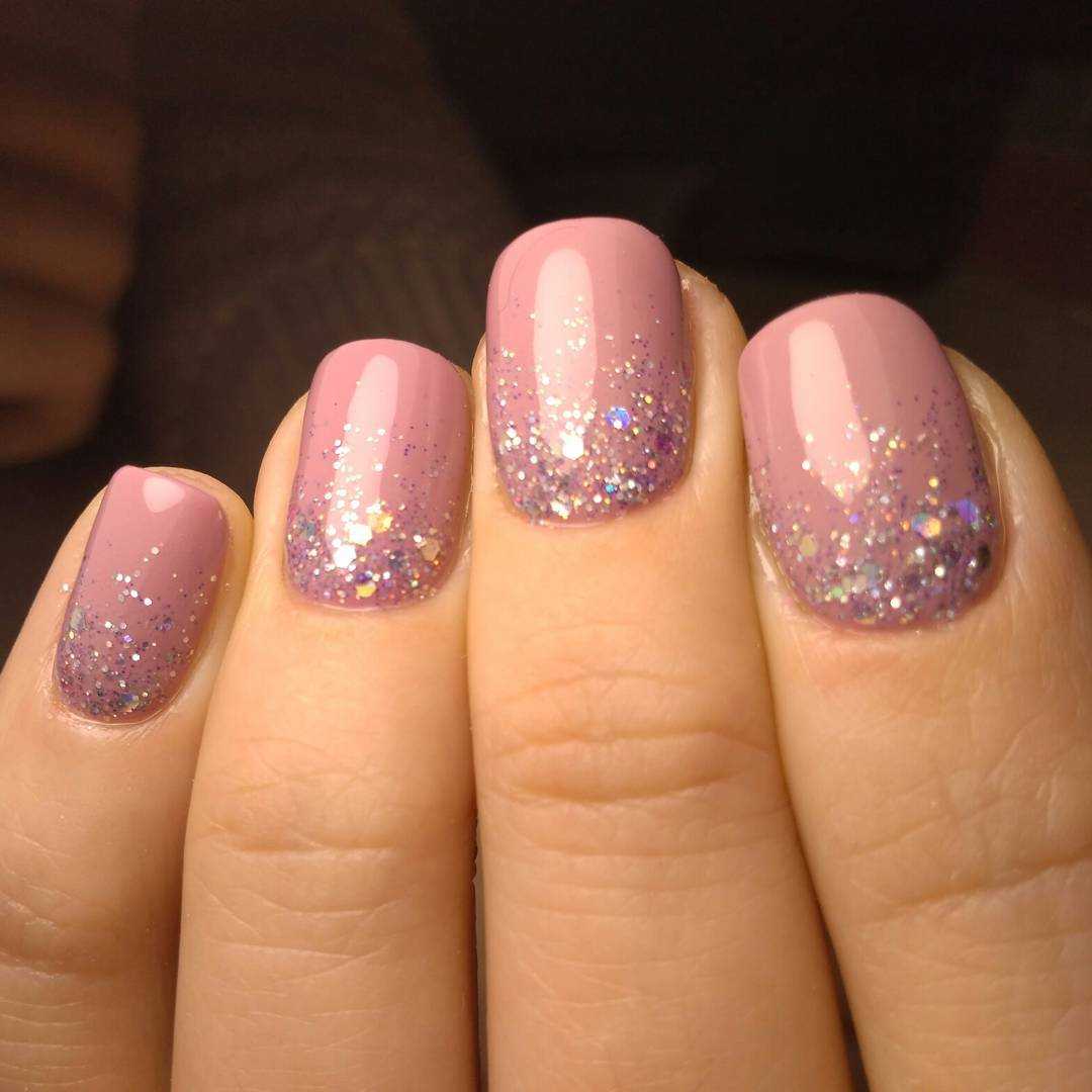 Маникюр с однотонным дизайном розовыми блестками/фольгой всех пальчиков подходит загорелой и бледной коже. А если хотите экспериментов, попробуйте блестками украсить только кончики ногтей, выполнить растяжку или дизайн.
