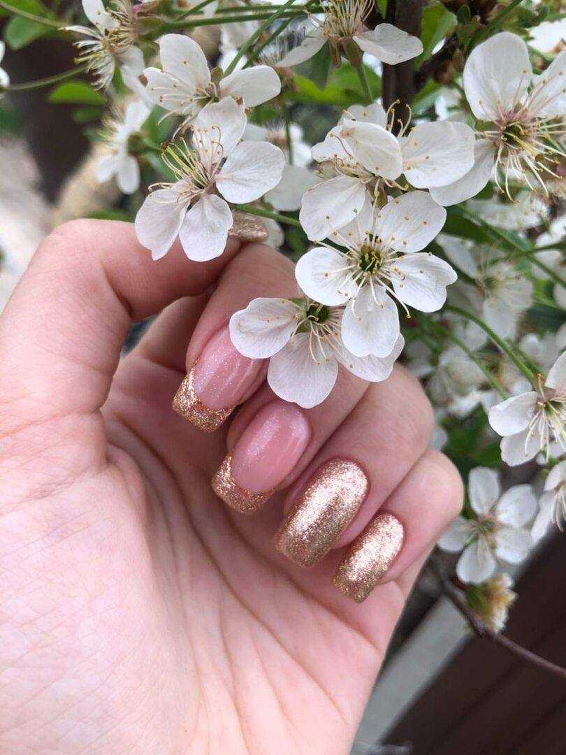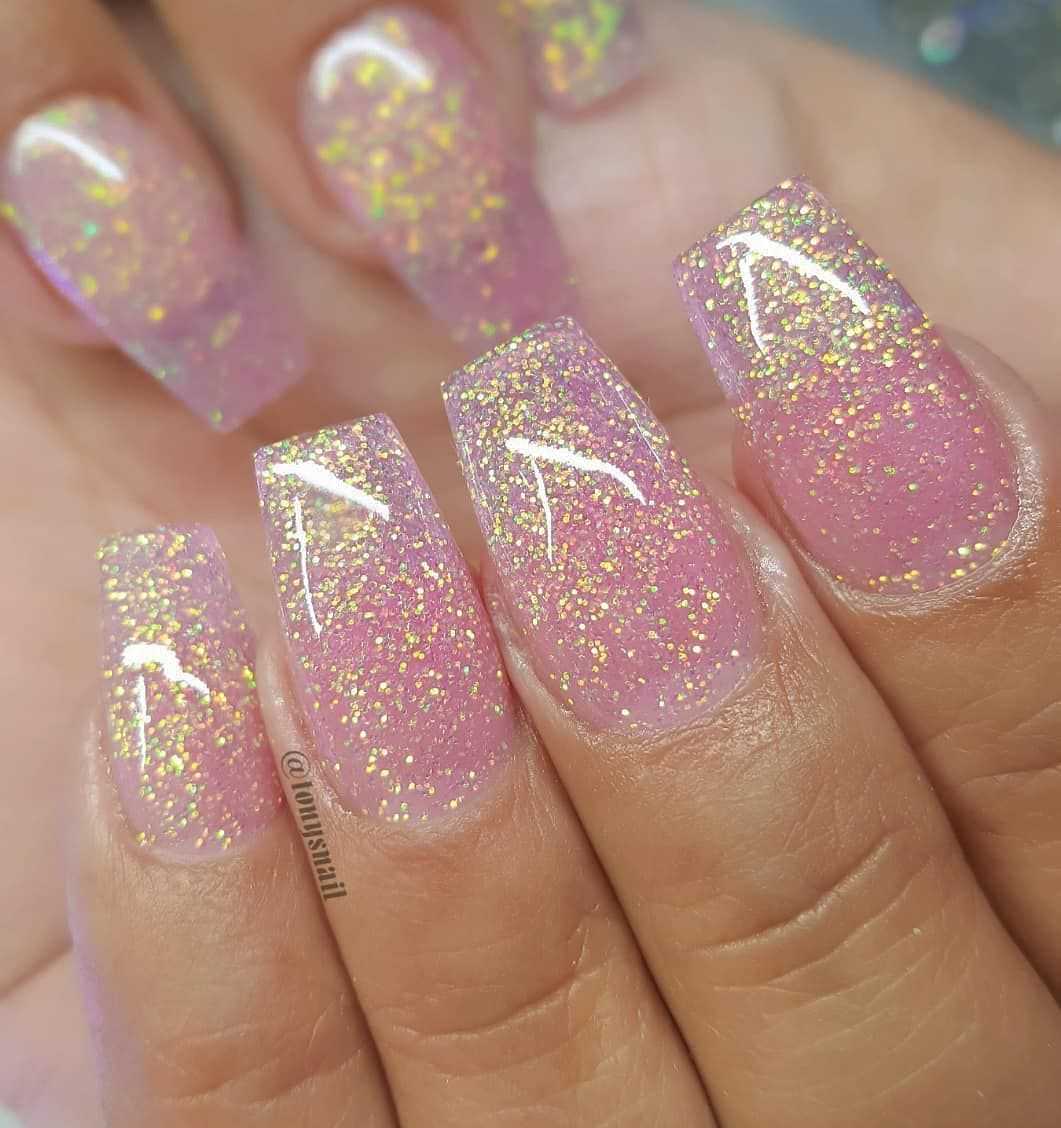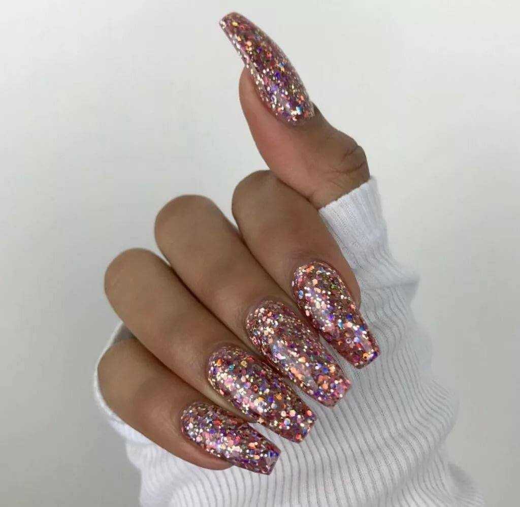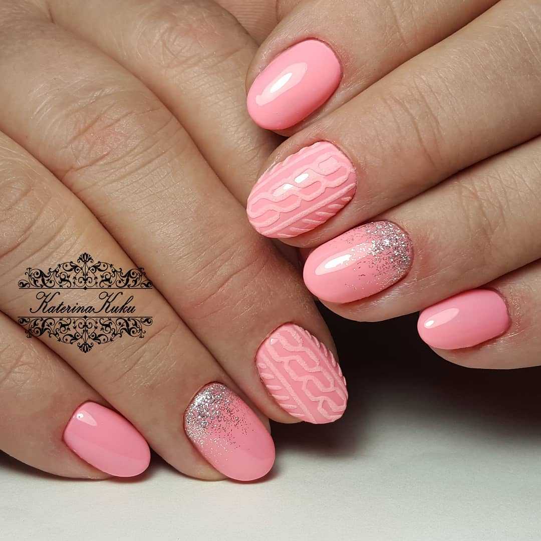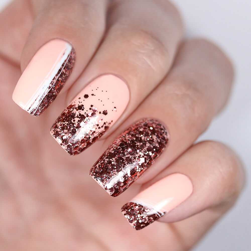 Маникюр с однотонным дизайном розовыми блестками/фольгой всех пальчиков подходит загорелой и бледной коже. А если хотите экспериментов, попробуйте блестками украсить только кончики ногтей, выполнить растяжку или дизайн.