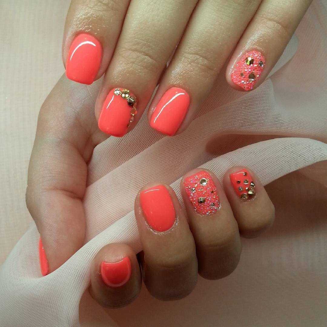 Используйте для маникюра насыщенный розовый гель-лак. На один палец добавьте разноцветных страз или мелких камешков.