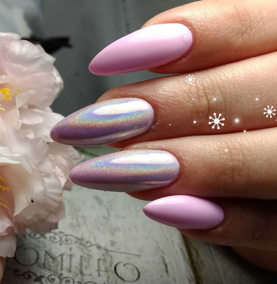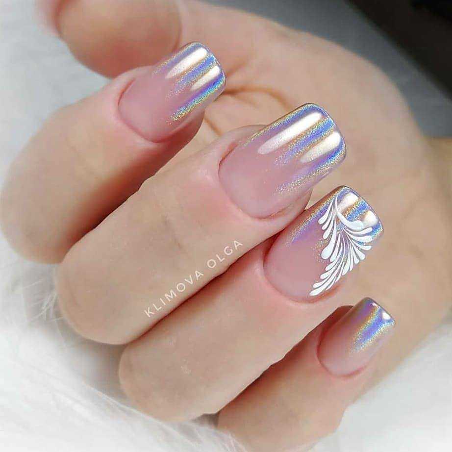 В тандеме с розовыми оттенками отлично работает жемчужная, зеркальная, голографическая втирка