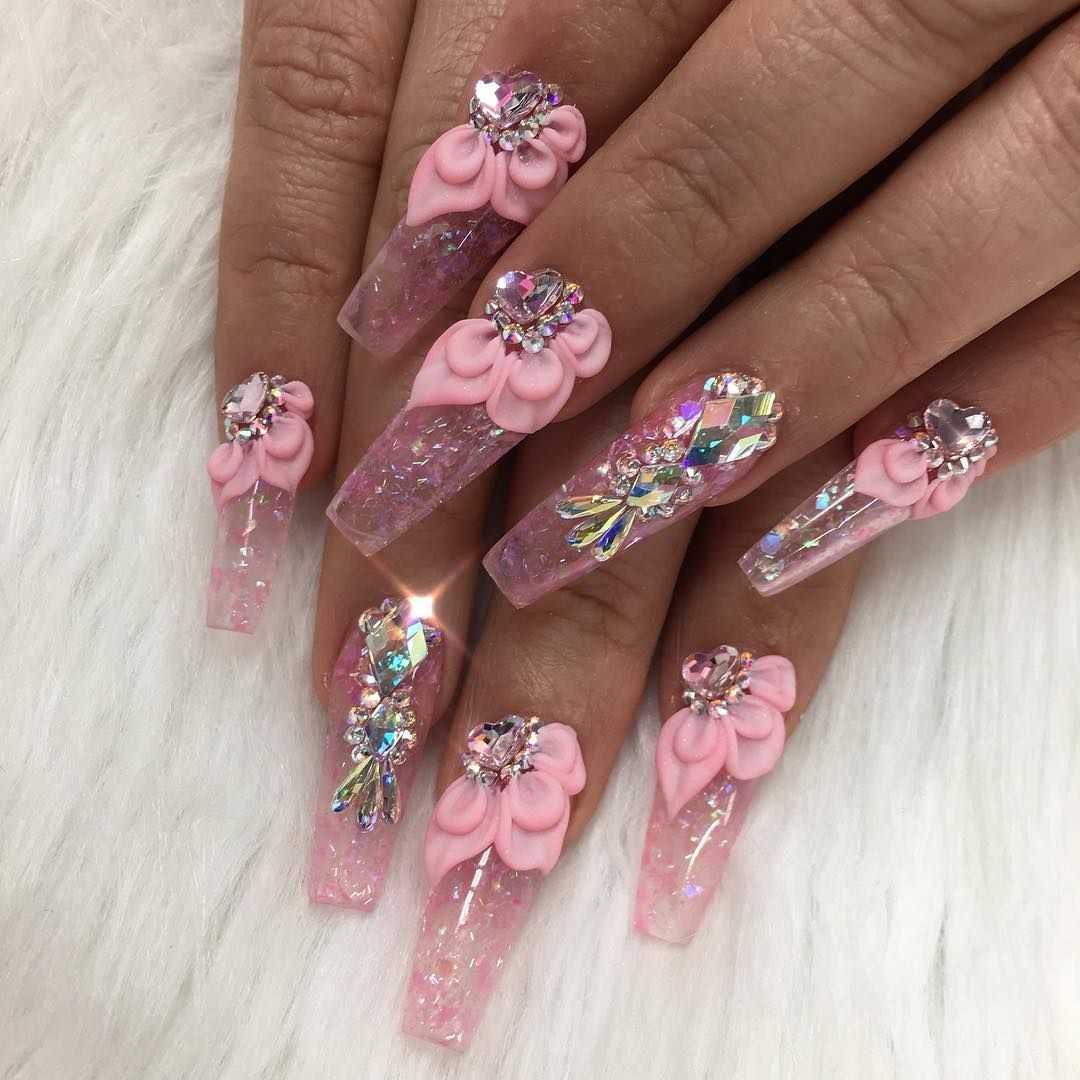 Длинные ногти – отличная возможность для творческих экспериментов с розовым маникюром. В 2023 году на пике популярности объемный розовый маникюр, который можно создать с помощью гелевых лаков, акриловых пудр и других материалов. Для создания объемного маникюра можно использовать технику 3D-дизайна, например, создавать цветочные композиции, бабочки, кристаллы и т.д.