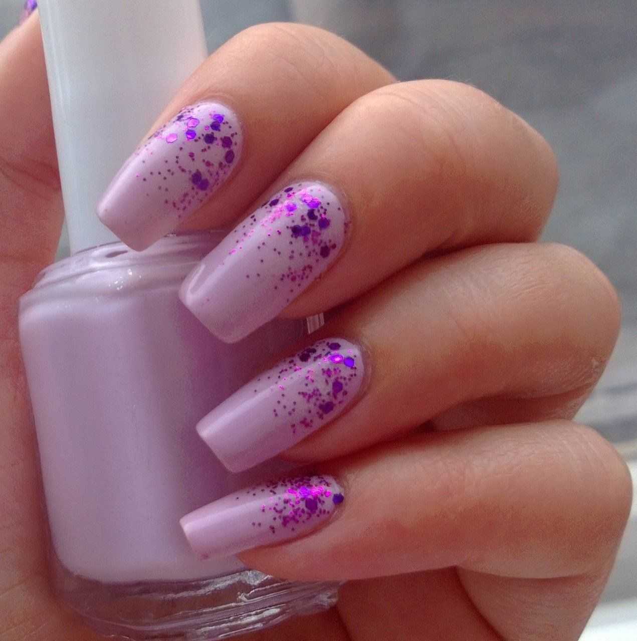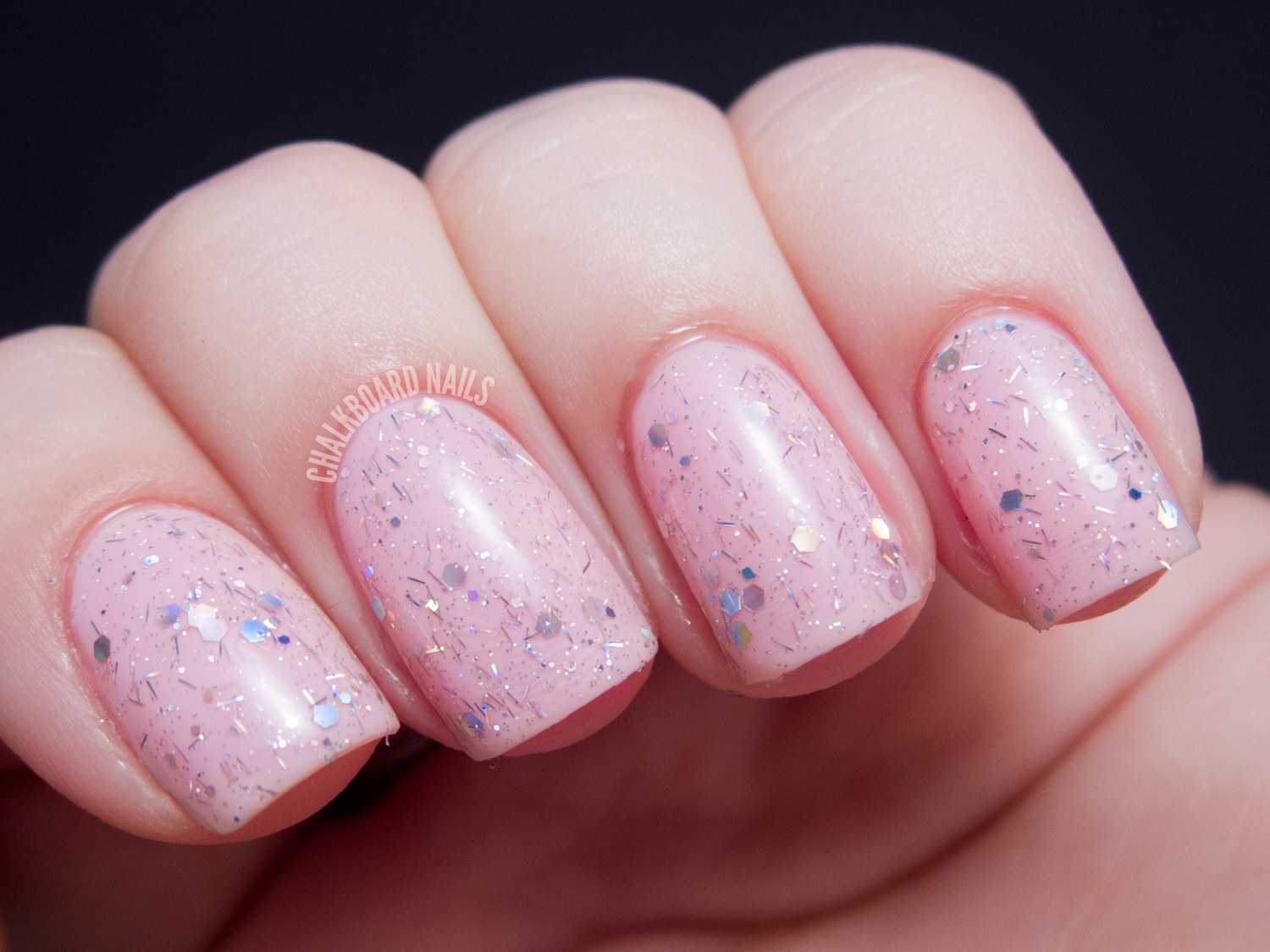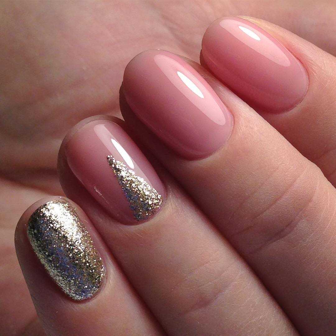 Нанесите нежно-розовый глянцевый лак по всем ногтевым пластинам, а в основании двух-трех «рассыпьте» немного блесток.