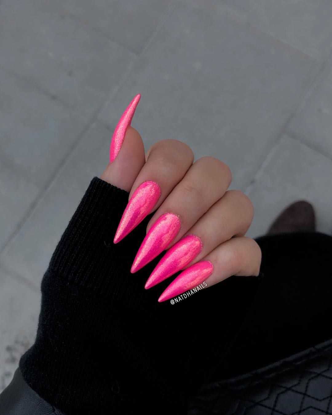 Почувствовать себя королевой диско и выделить маникюр из тысячи поможет неоновый розовый дизайн. Яркий акцент в образе с помощью неонового стильного дизайна, который можно выполнить по-разному: