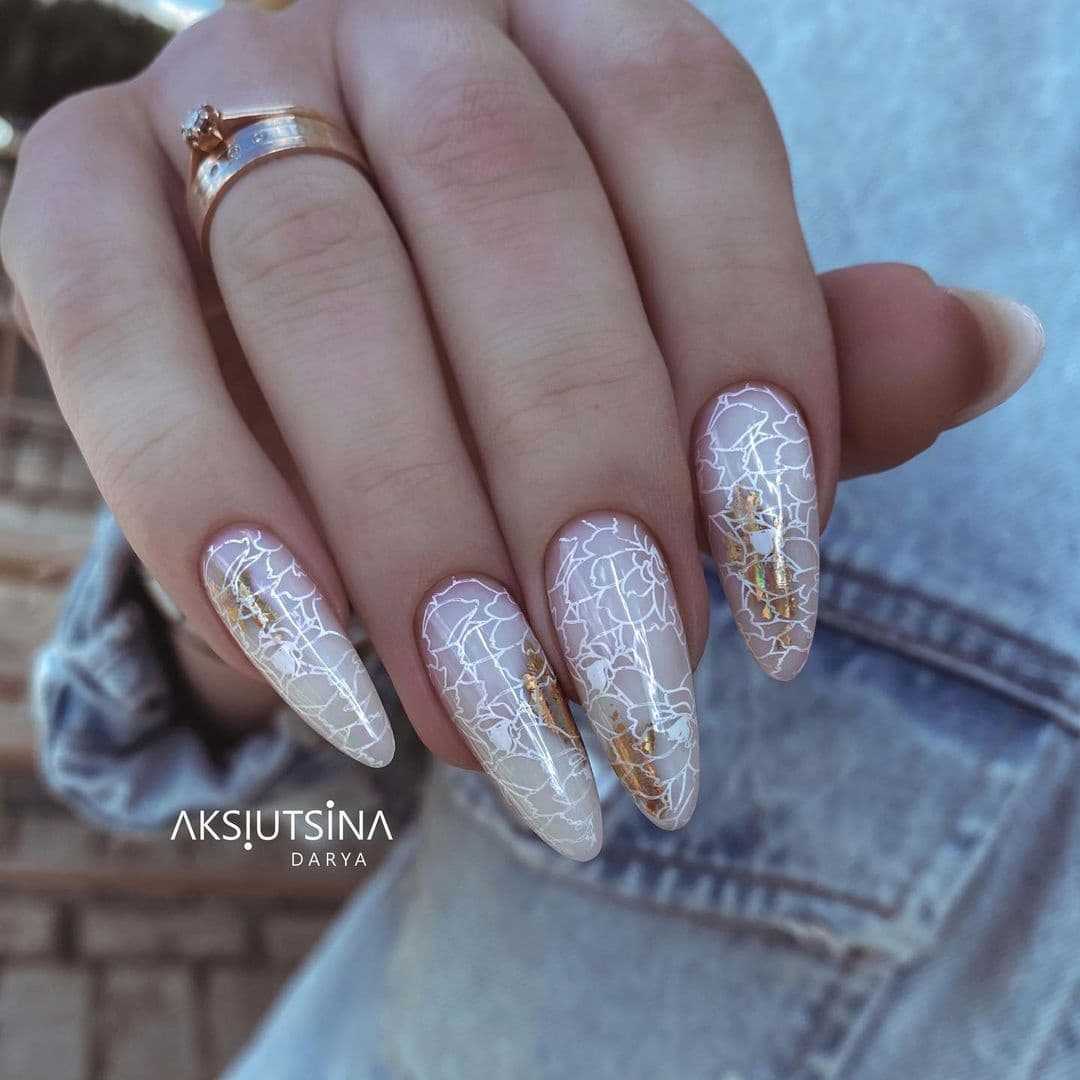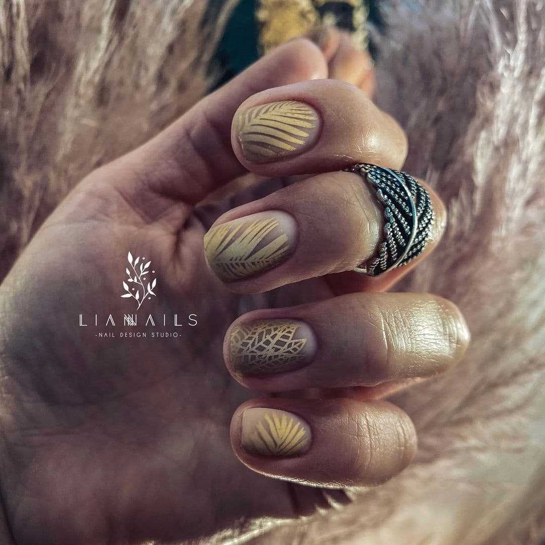 Если вместе с белым, черным или красным цветом золото усиливает насыщенность и яркость общей картины, то с нежными оттенками все обстоит иначе. Даже ярко-розовый маникюр с дизайном будет выглядеть уместно, если сопроводить его золотой фольгой или декоративными элементами. А полупрозрачные базы так вообще очень гармонично выглядят даже с самым сияющим декором