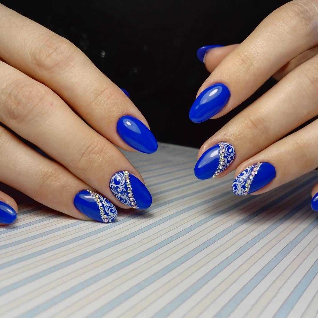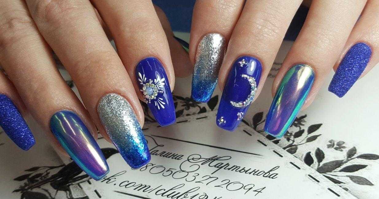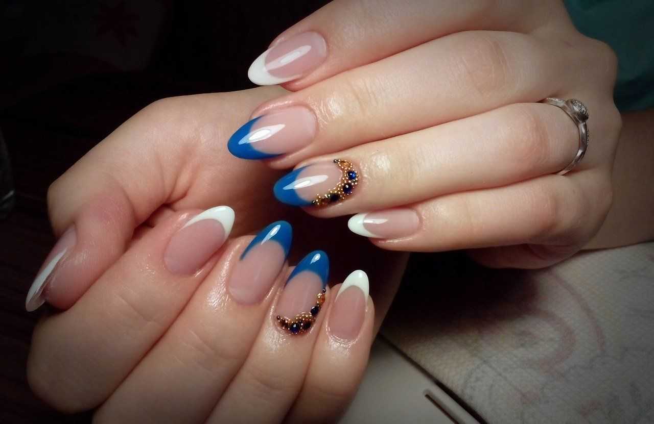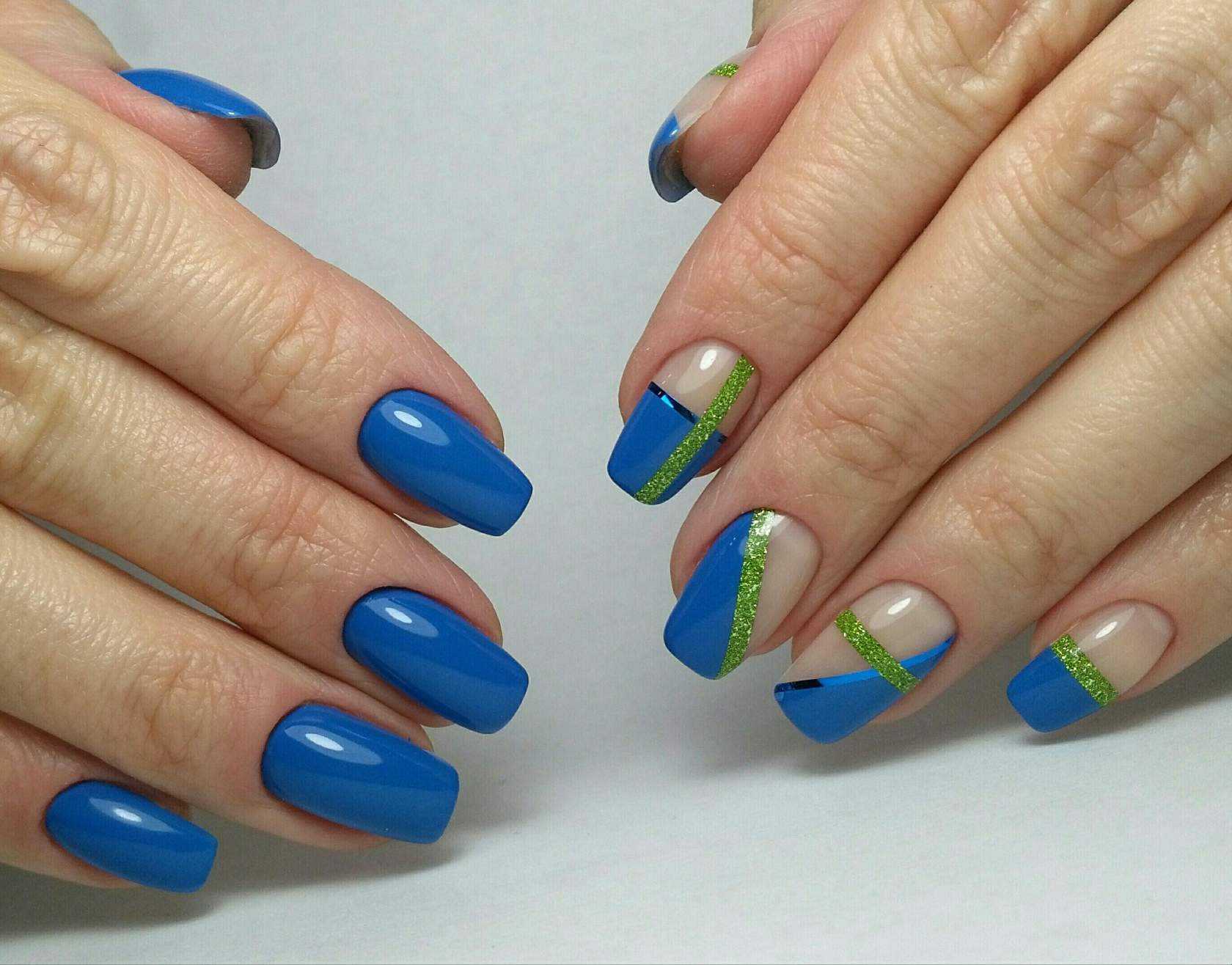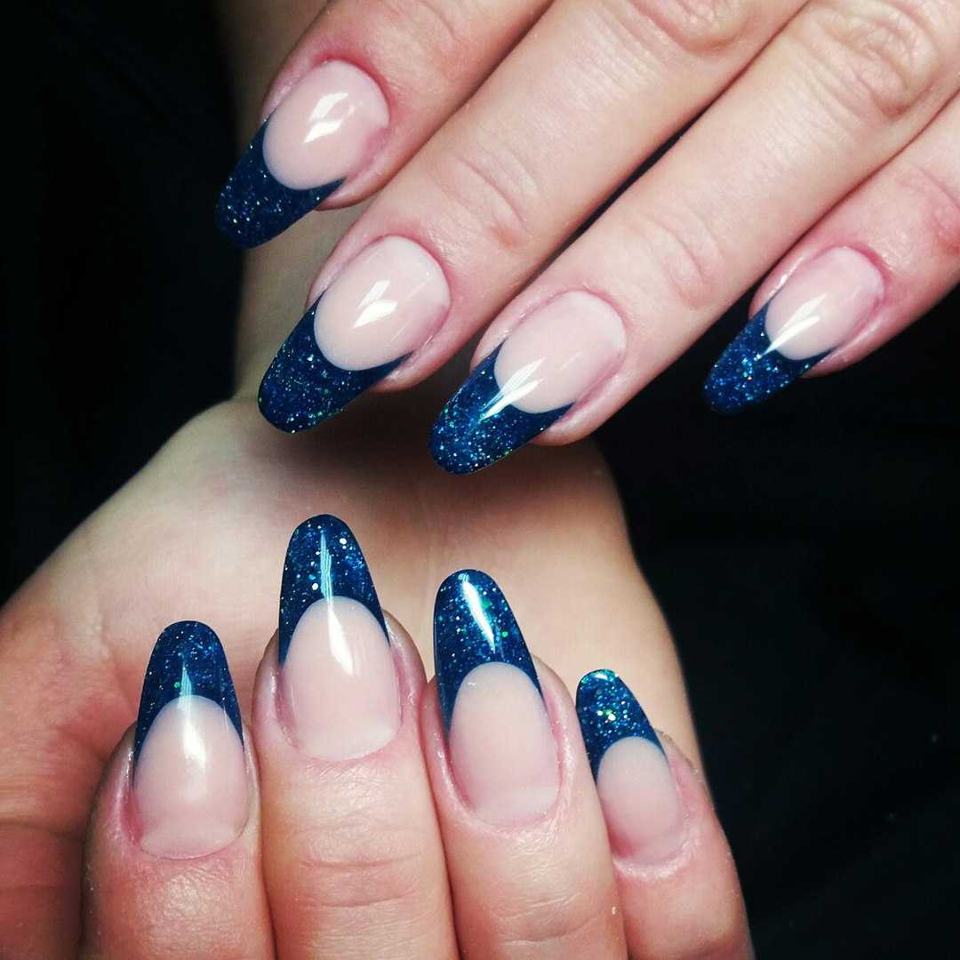 Чтобы почувствовать себя особенной женщиной, мастера маникюра могут предложить вам огромное обилие дизайнерских nаil-решений. Длинные ногти придадут вам стильный и утонченный образ. Для длинных ногтей миндалевидной формы отличным вариантом будет стильный синий френч. Френч из глиттера также смотрится необычно и ярко.