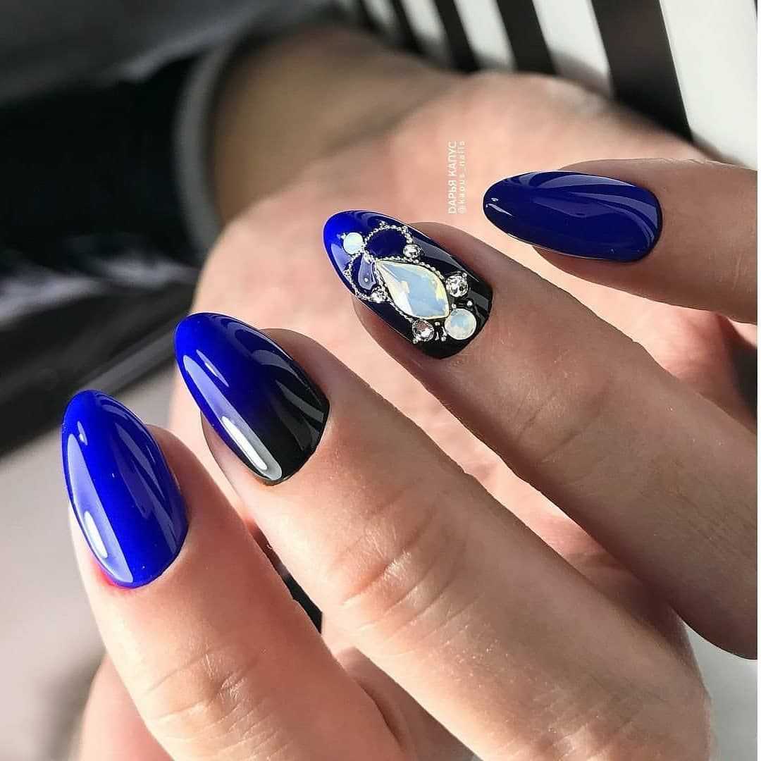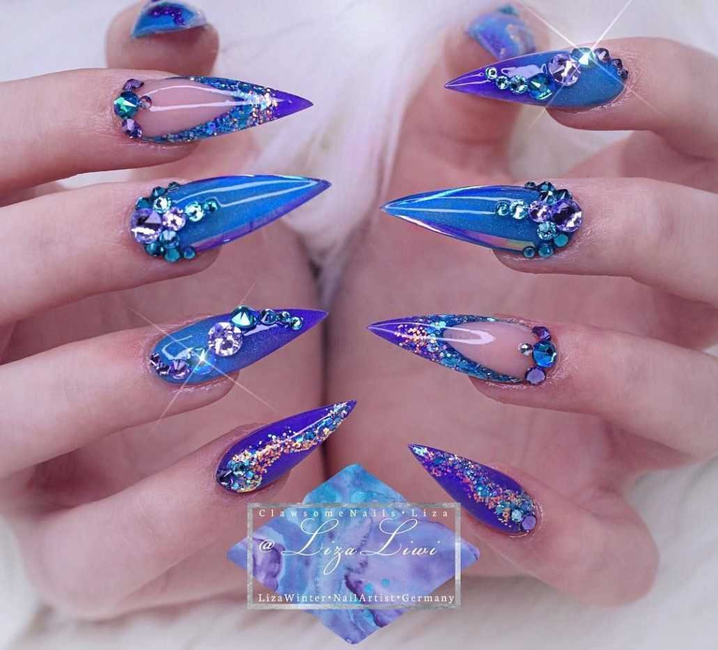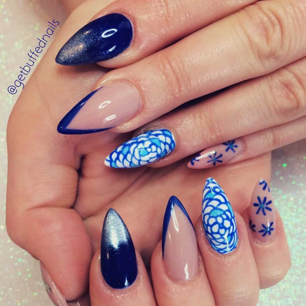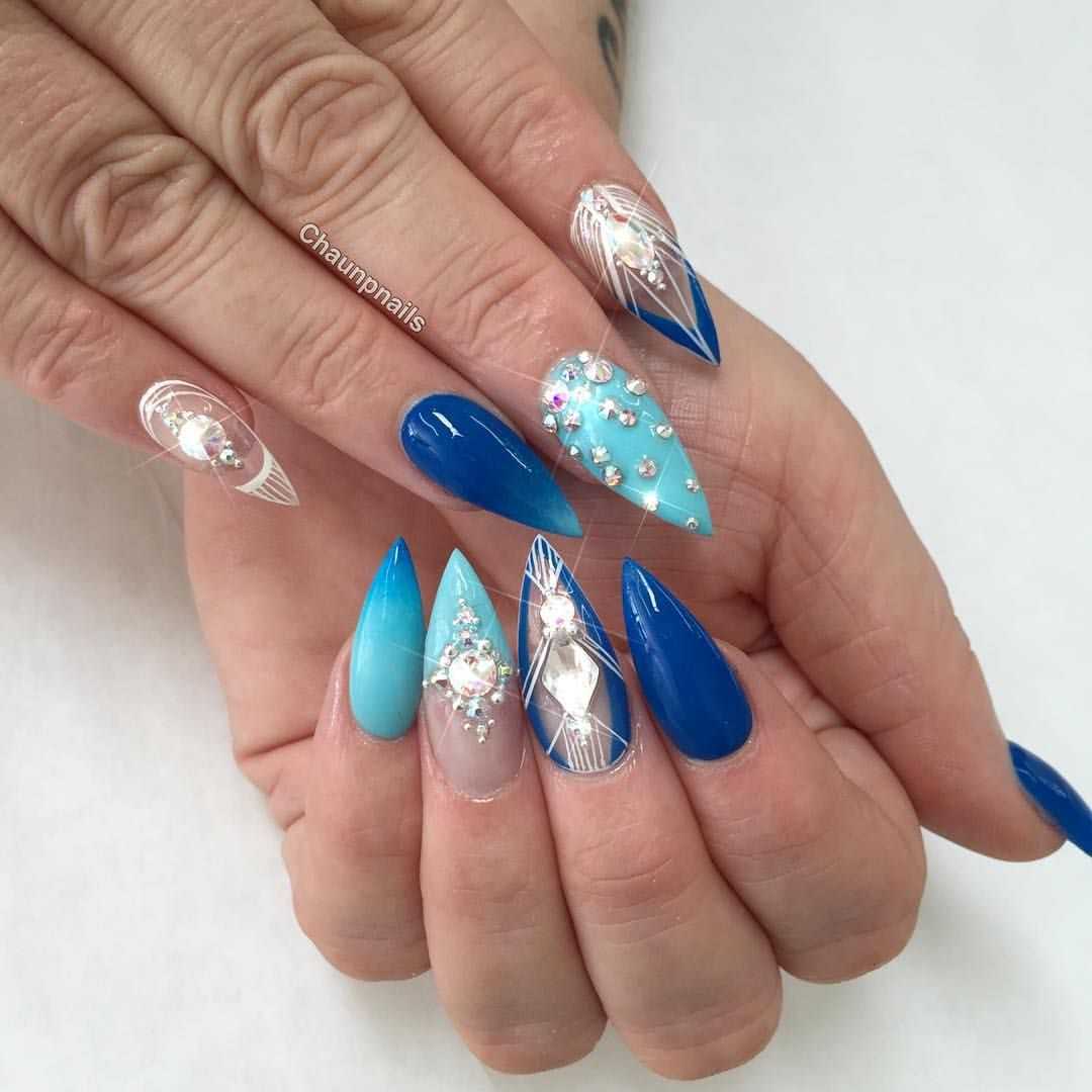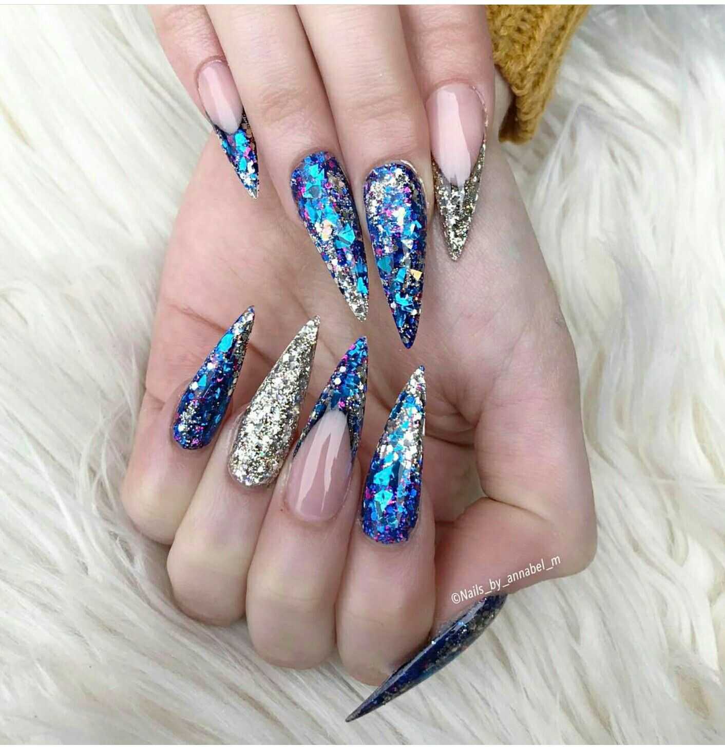 Чтобы почувствовать себя особенной женщиной, мастера маникюра могут предложить вам огромное обилие дизайнерских nаil-решений. Длинные ногти придадут вам стильный и утонченный образ. Для длинных ногтей миндалевидной формы отличным вариантом будет стильный синий френч. Френч из глиттера также смотрится необычно и ярко.