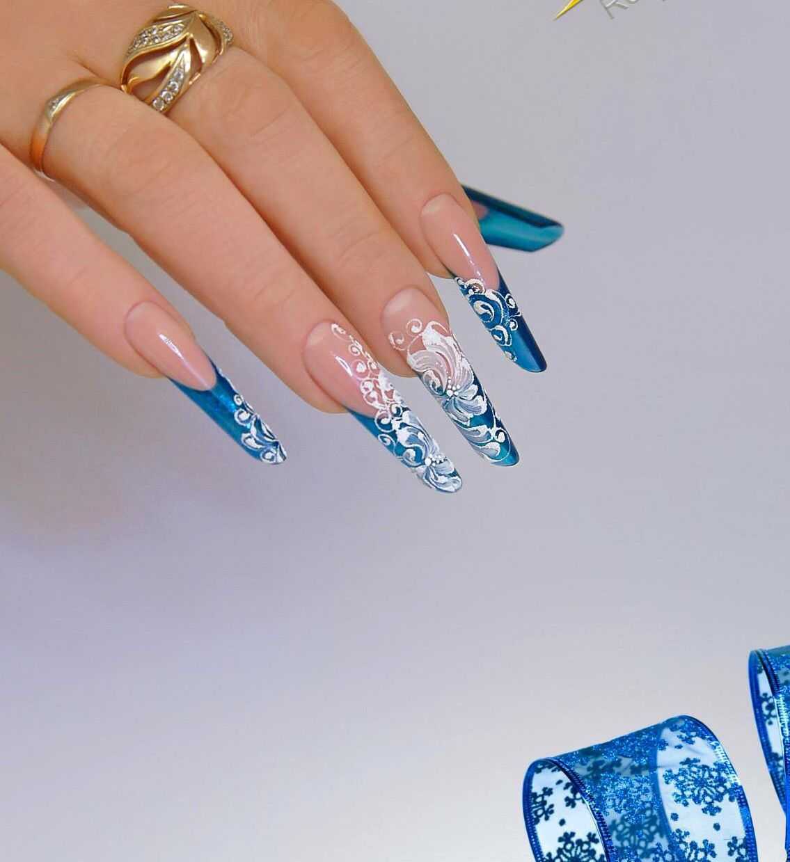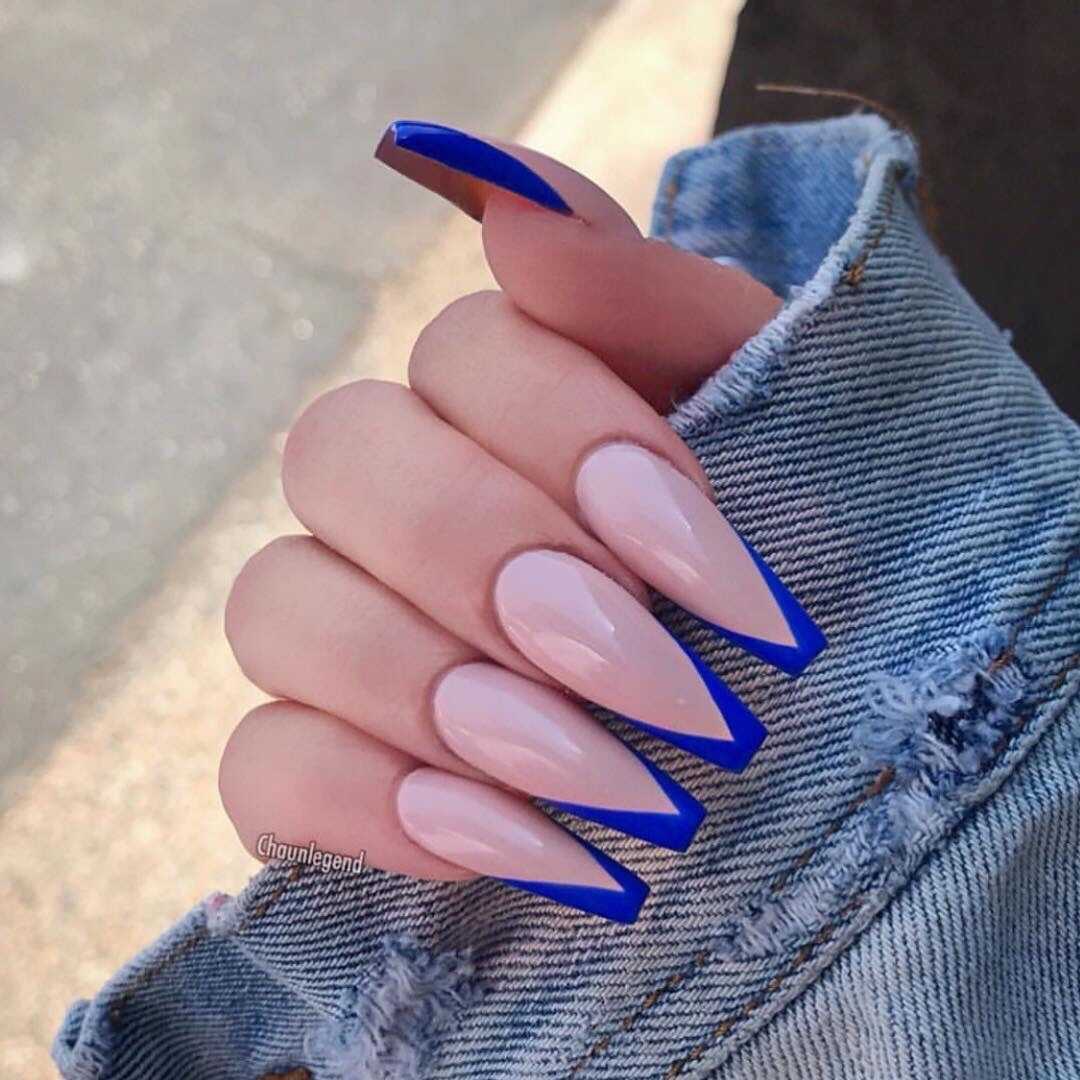 Синий французский маникюр на длинных ногтях