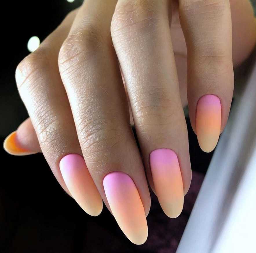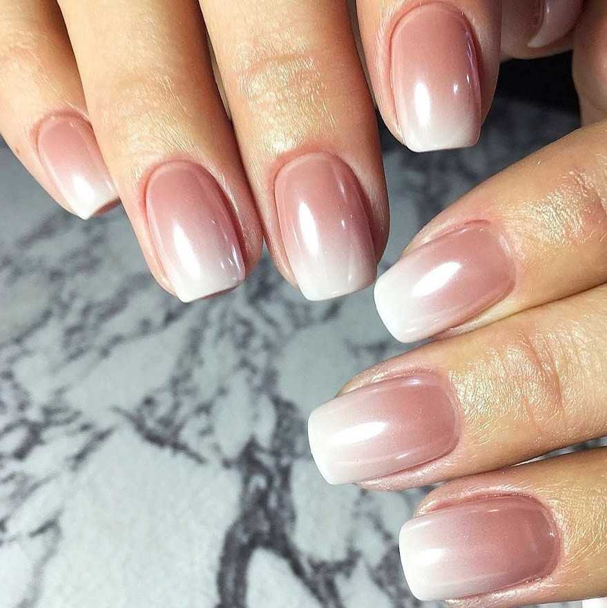 Френч градиент можно сделать гель-лаками или пигментами. Градиентные кончики делаются по тому же принципу, что и обычная прорисовка от руки, только одновременно применяется не один цвет, а несколько и разные части линии улыбки прокрашиваются своим оттенком. В конце границы растушевываются и получается красивый градиентный переход.