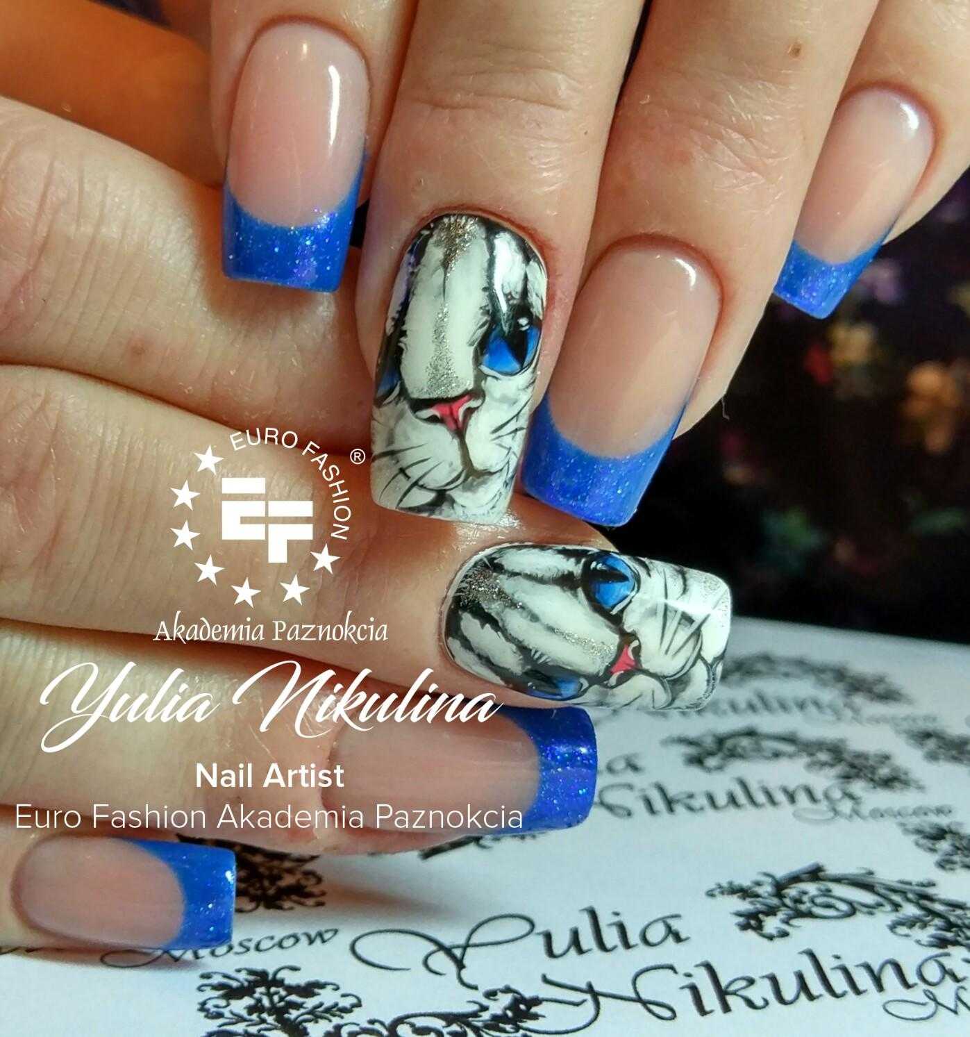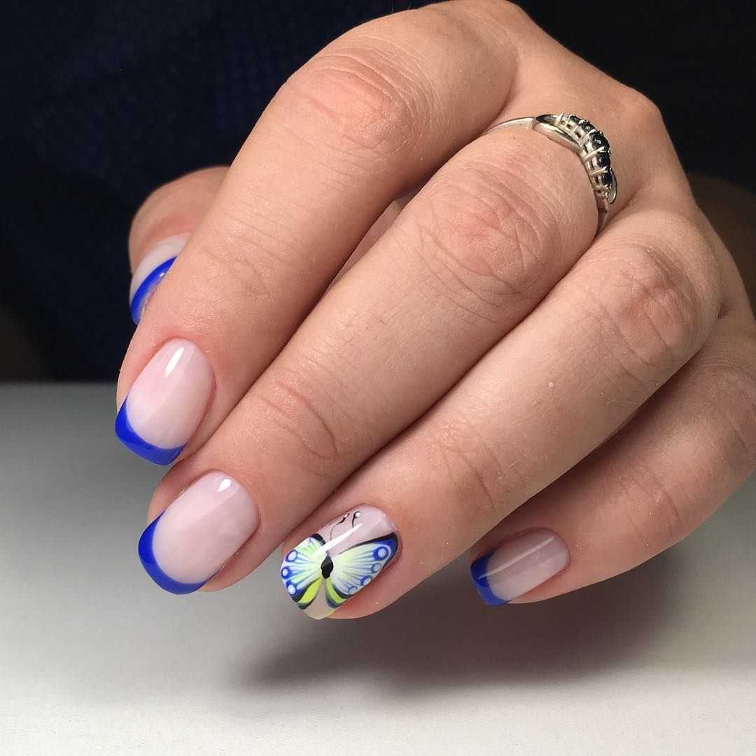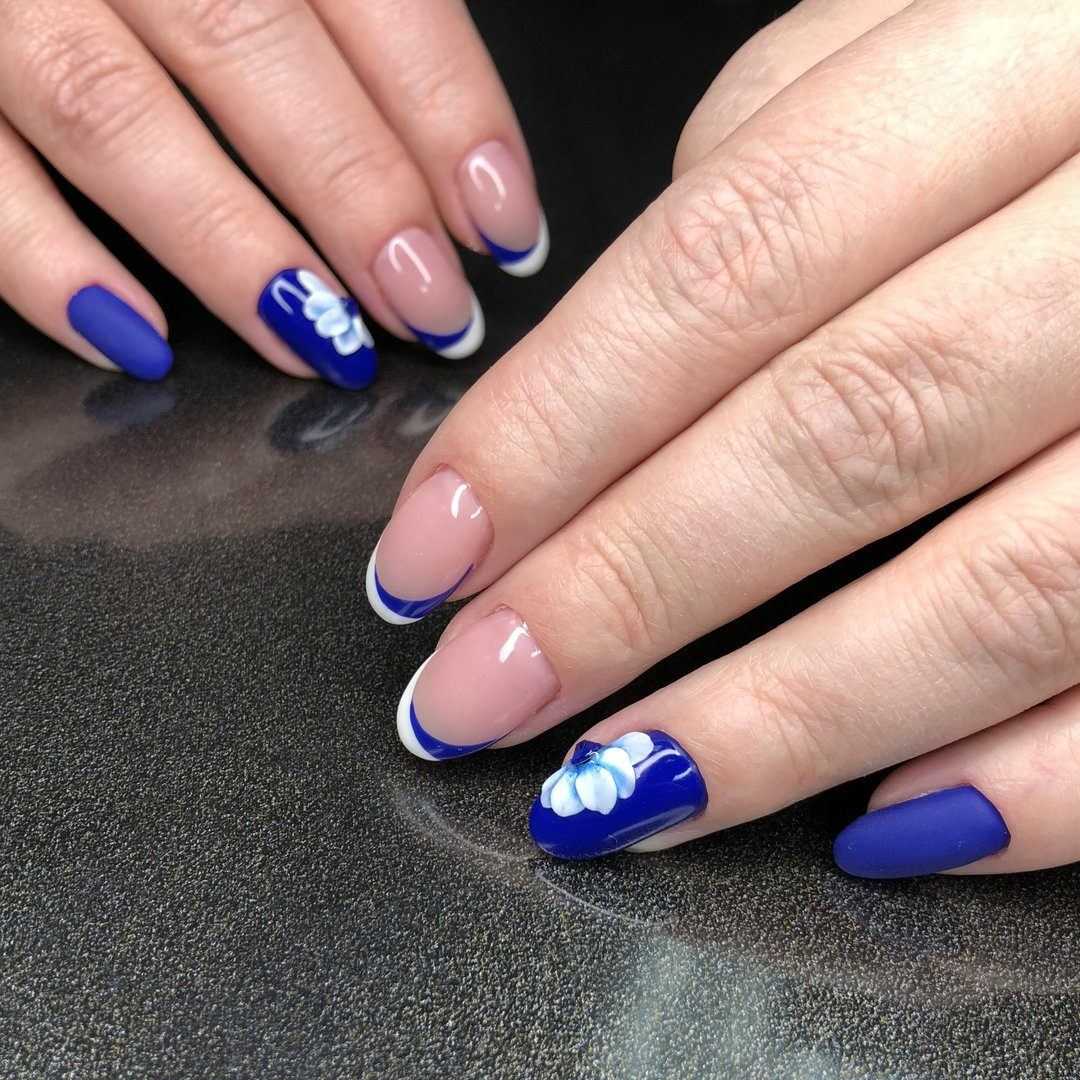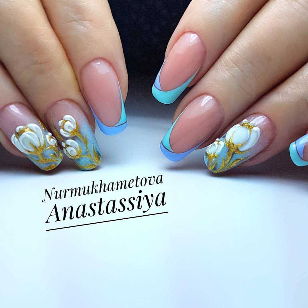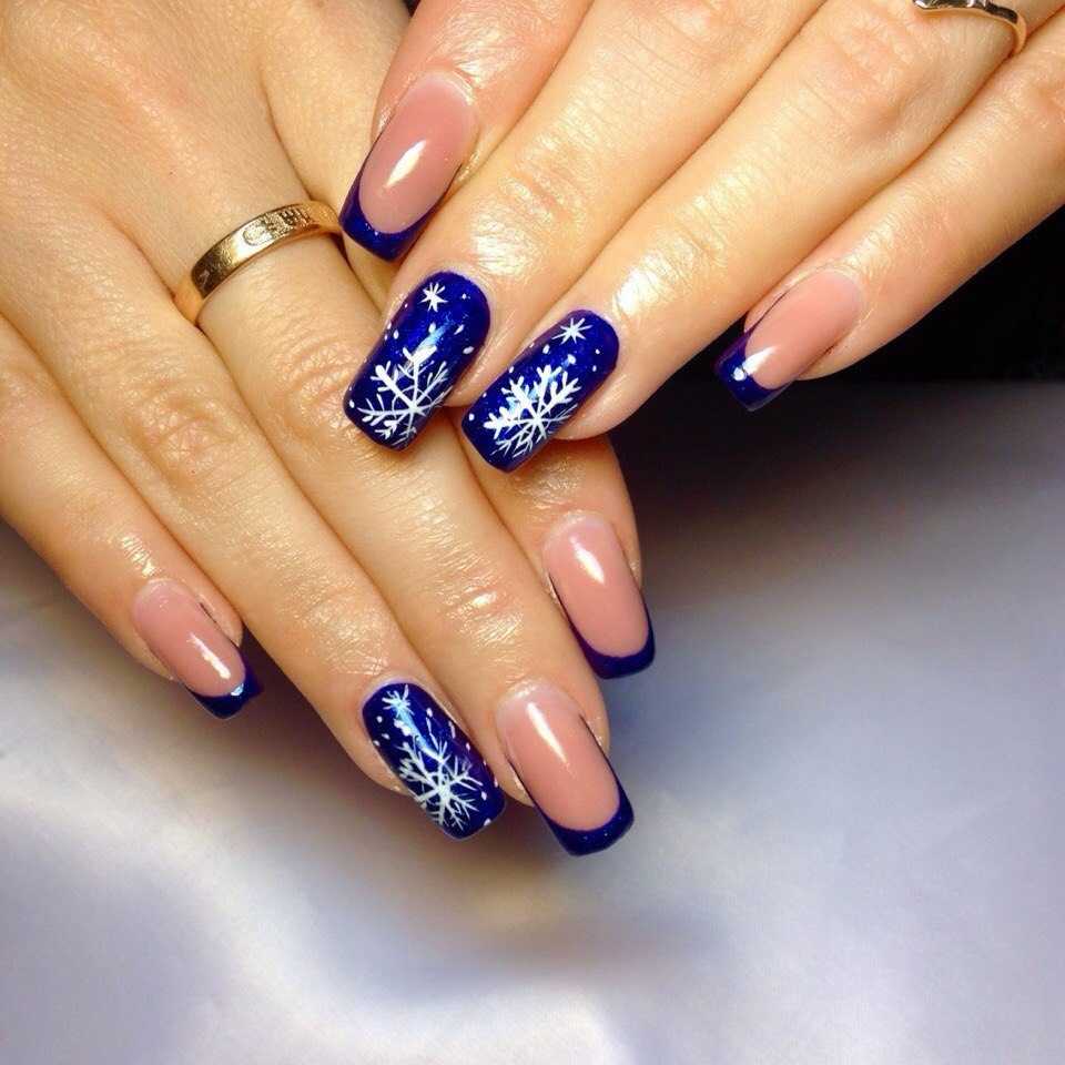 Объемный рисунок и синий френч Выполнить подобный дизайн можно при помощи 3d-геля или акрила. Сначала выполняется классический французский маникюр синим цветом, ногтевое ложе при этом покрывается камуфляжным материалом с вкраплением блесток или мелкого глитера. А уже потом выполняется объемный рисунок.