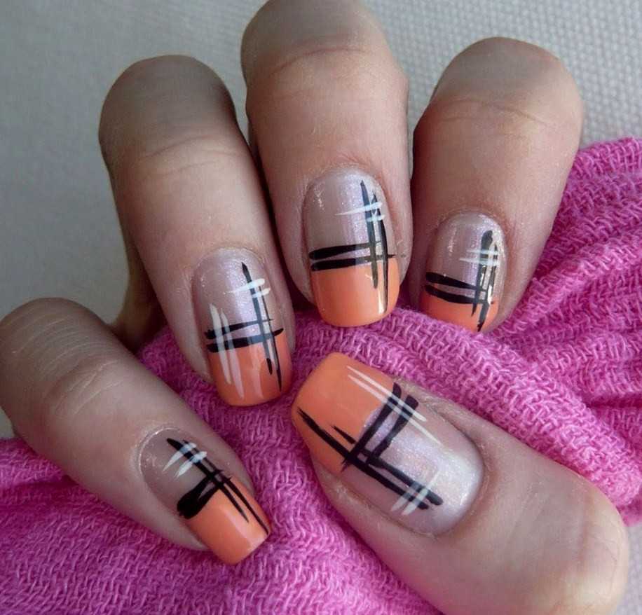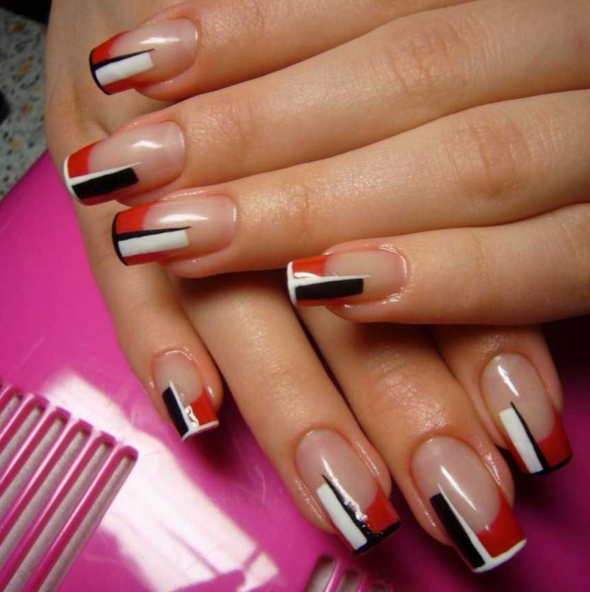 Абстракция на ноготках – это нанесение бесформенных линий, изображений. Полоски французского дизайна лучше делать белыми, а декор – более ярким.