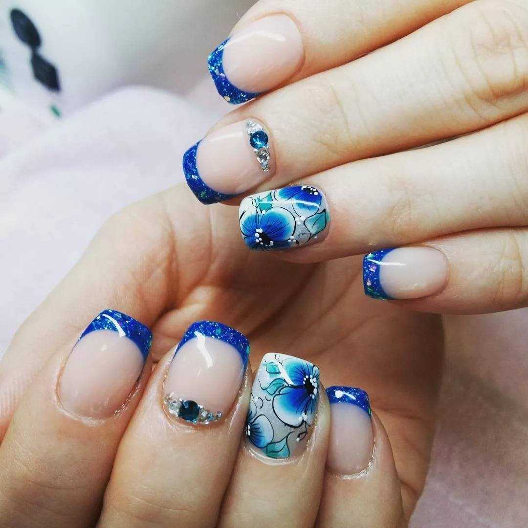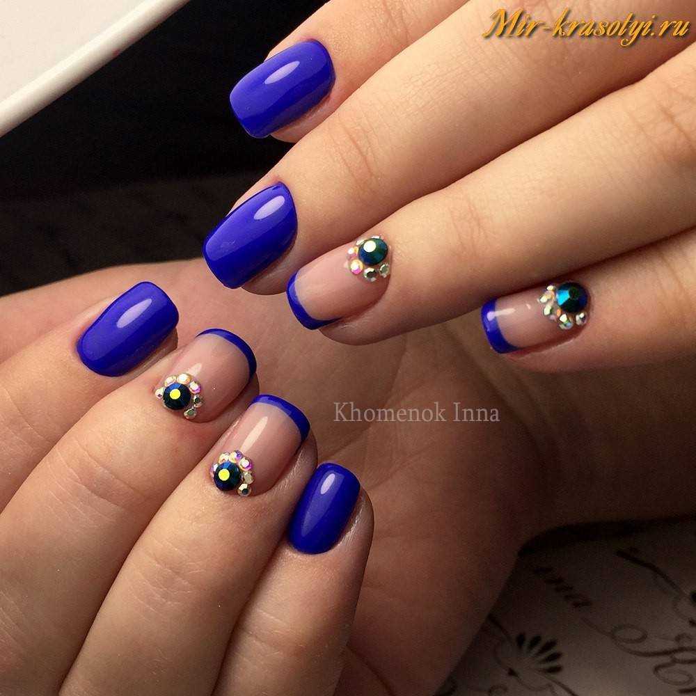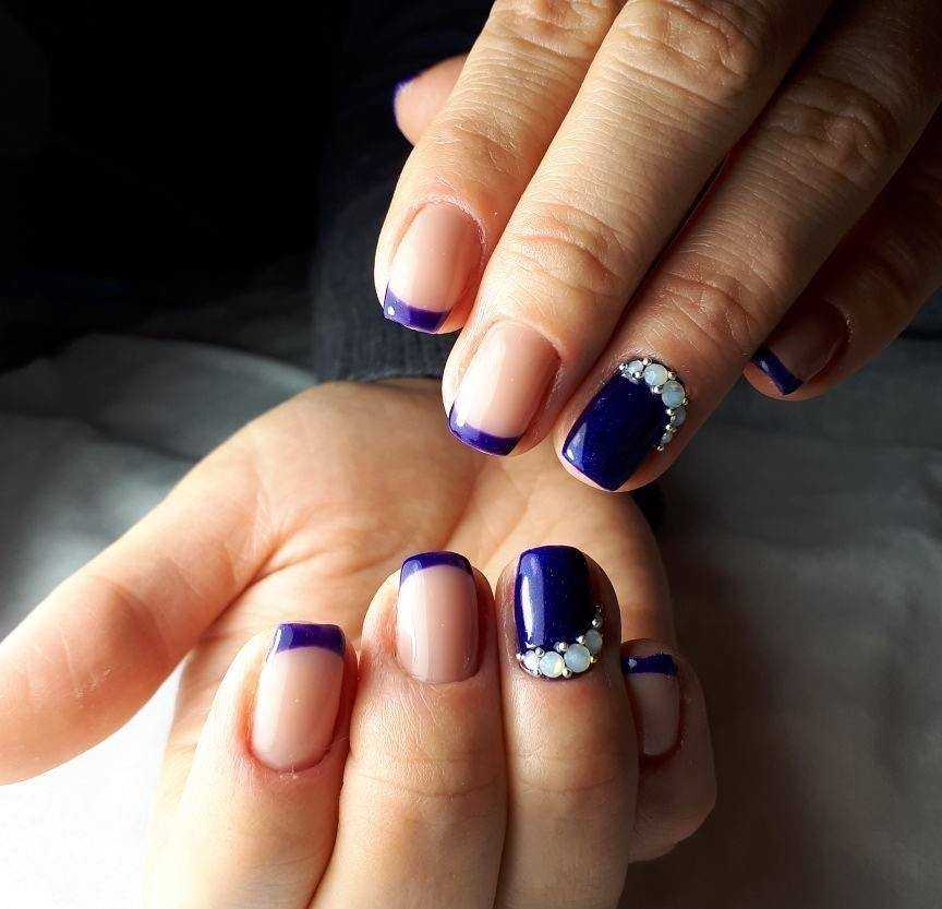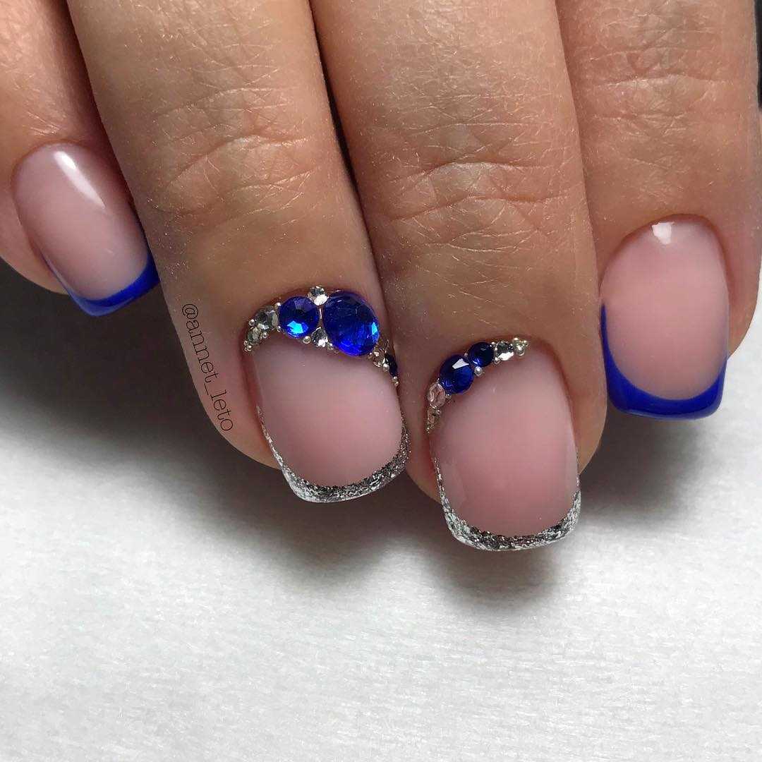 Французский маникюр в синем цвете со стразами и блестками