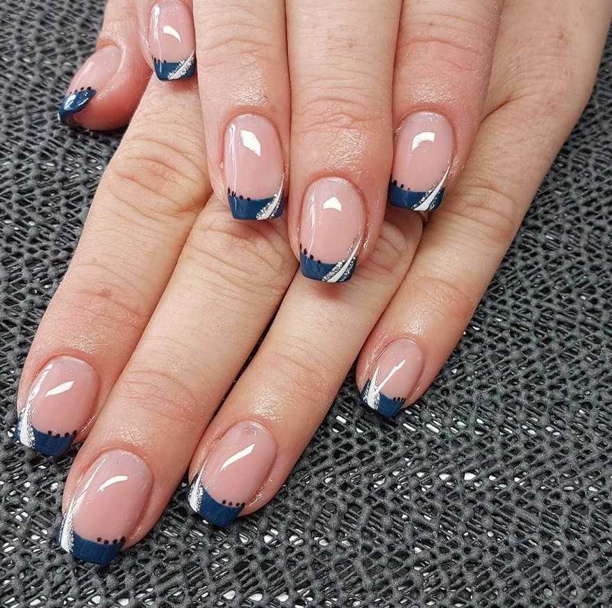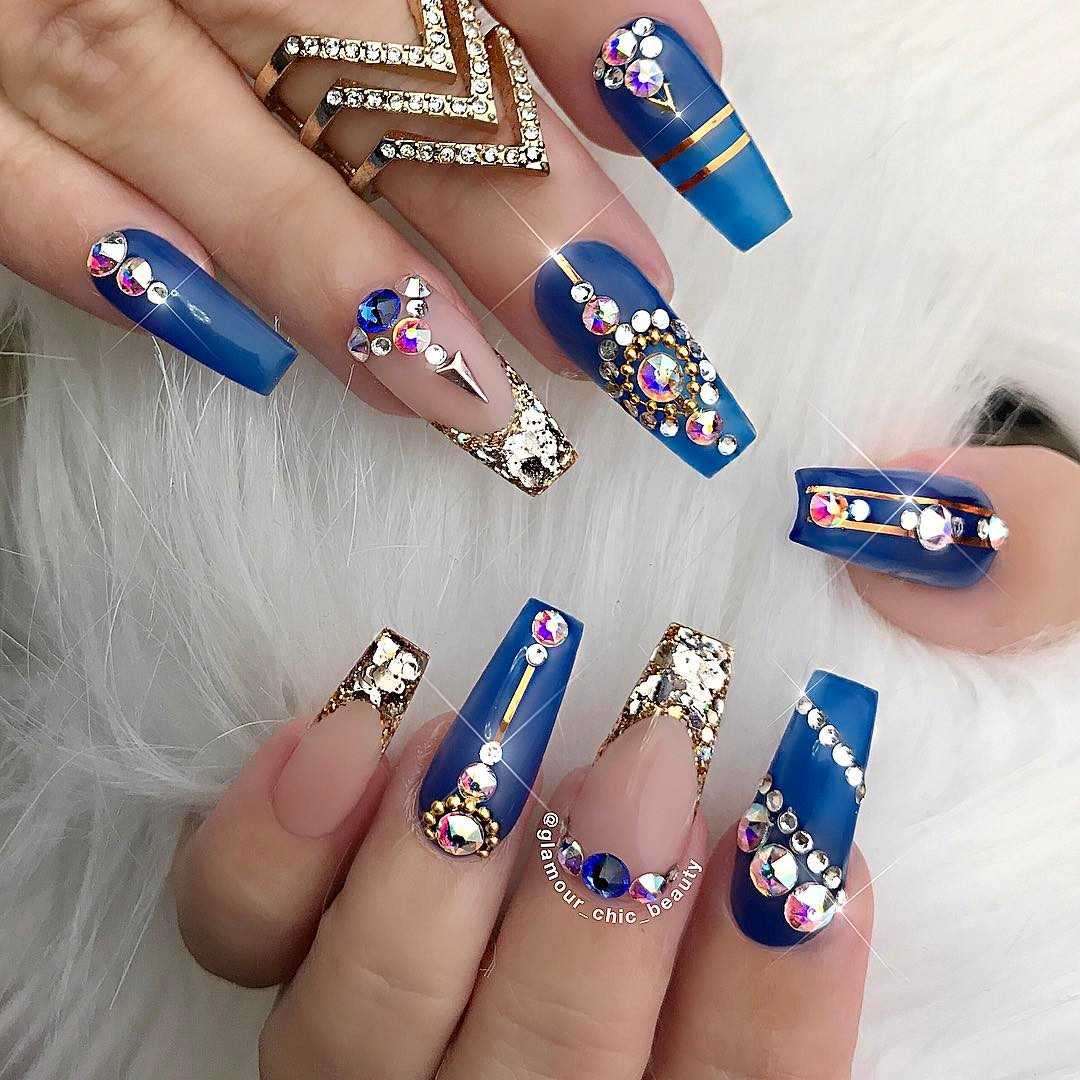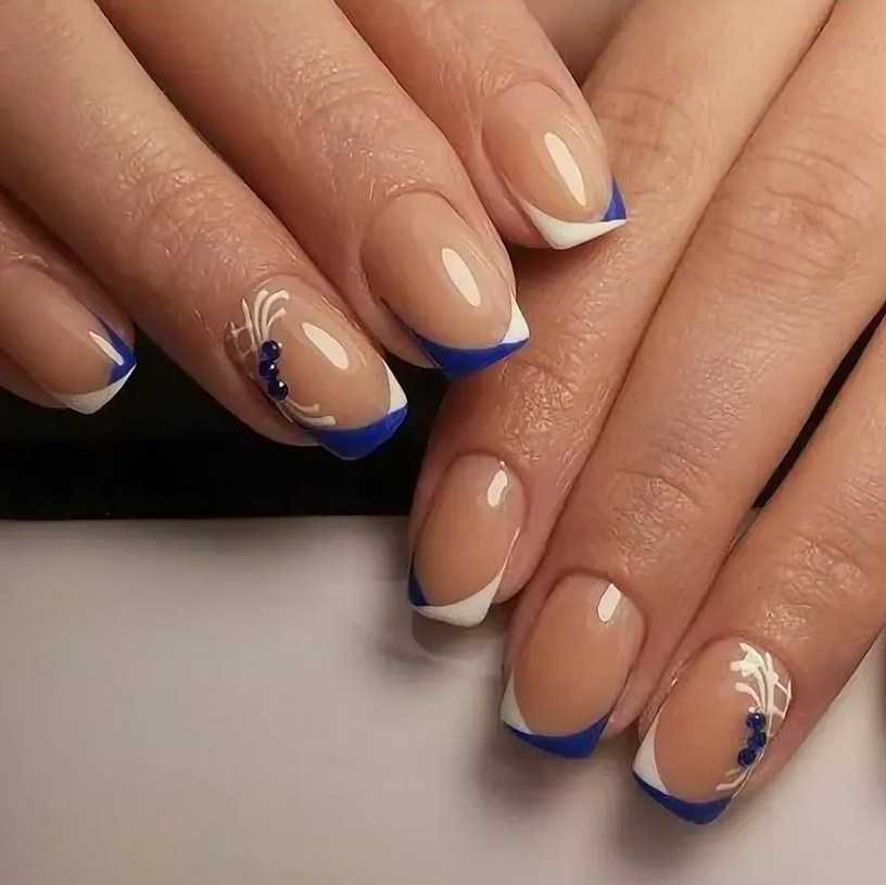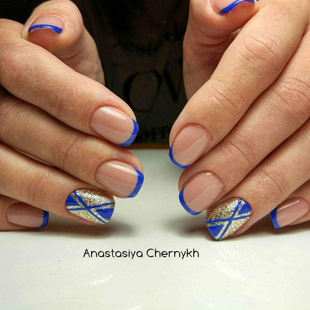 Французский маникюр в синем цвете со стразами и блестками