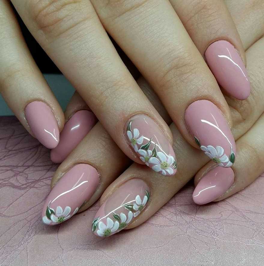 А весенний маникюр на короткие ногти — это сочетание нежных цветочков и веточек с теплыми пастельными тонами.