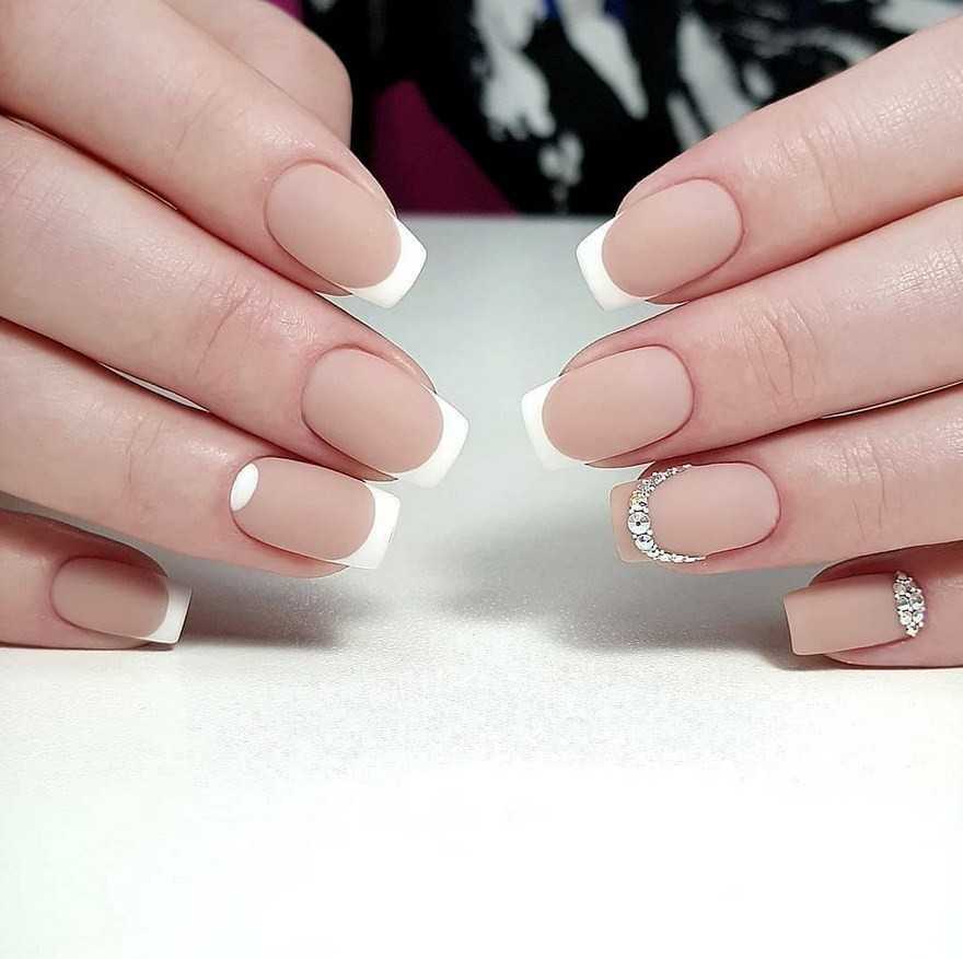 французский маникюр, украшенный стразами на белой части
