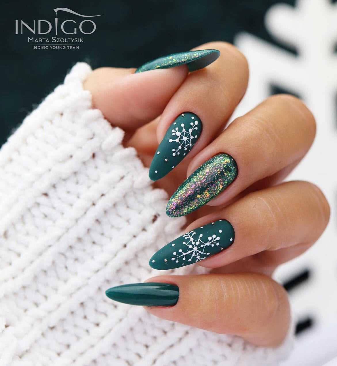 Дизайны с рисунками сейчас в тренде, это неоспоримый факт. В приоритете тонкие, хаотичные линии, многогранные рисунки с абстракциями, а также изображение полевых цветов. Не переусердствуйте, большое количество рисунков на каждом пальце недозволительно в 2023 году. Украсите один или несколько ногтей понравившимся вам рисунком и этого будет вполне достаточно. Чтобы рисунок на мятном полотне выглядел выразительно, четко и ярко, выбирайте контрастные цвета, например, отлично подойдет: черный или белый
