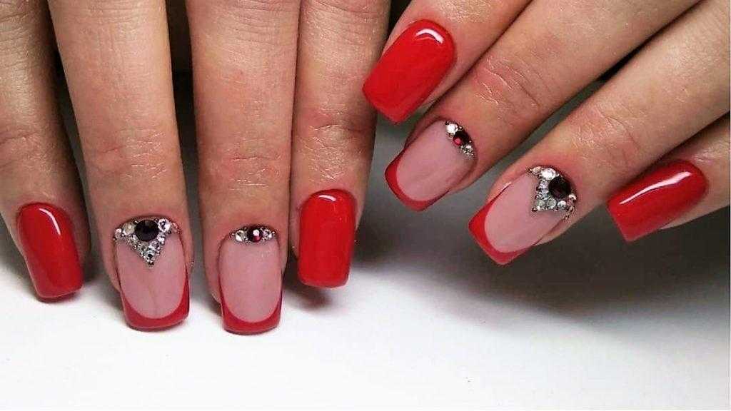 Красный френч или френч с элементами красного создает уникальный дизайн маникюра. Он страстный, яркий и необычайно притягательный. Красный красиво сочетается с черным, белым, золотом, серебром, фиолетовым, желтым и зеленым. Мастера часто используют его для создания рисунков цветов, которые могут быть переходящими.
