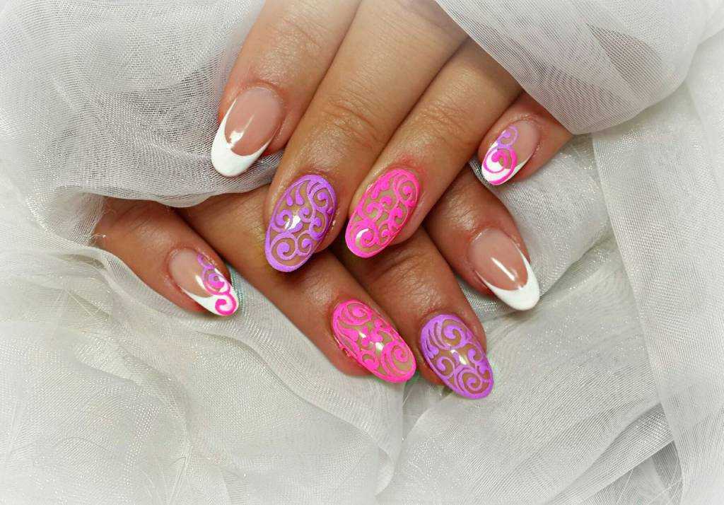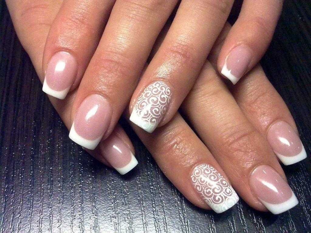 - Узоры. Ажурные завитки и загогулины акцентировали во «френче» только один-два ногтя, которые могли появляться на «голой» поверхности или на подготовленной с монохромным лаком.