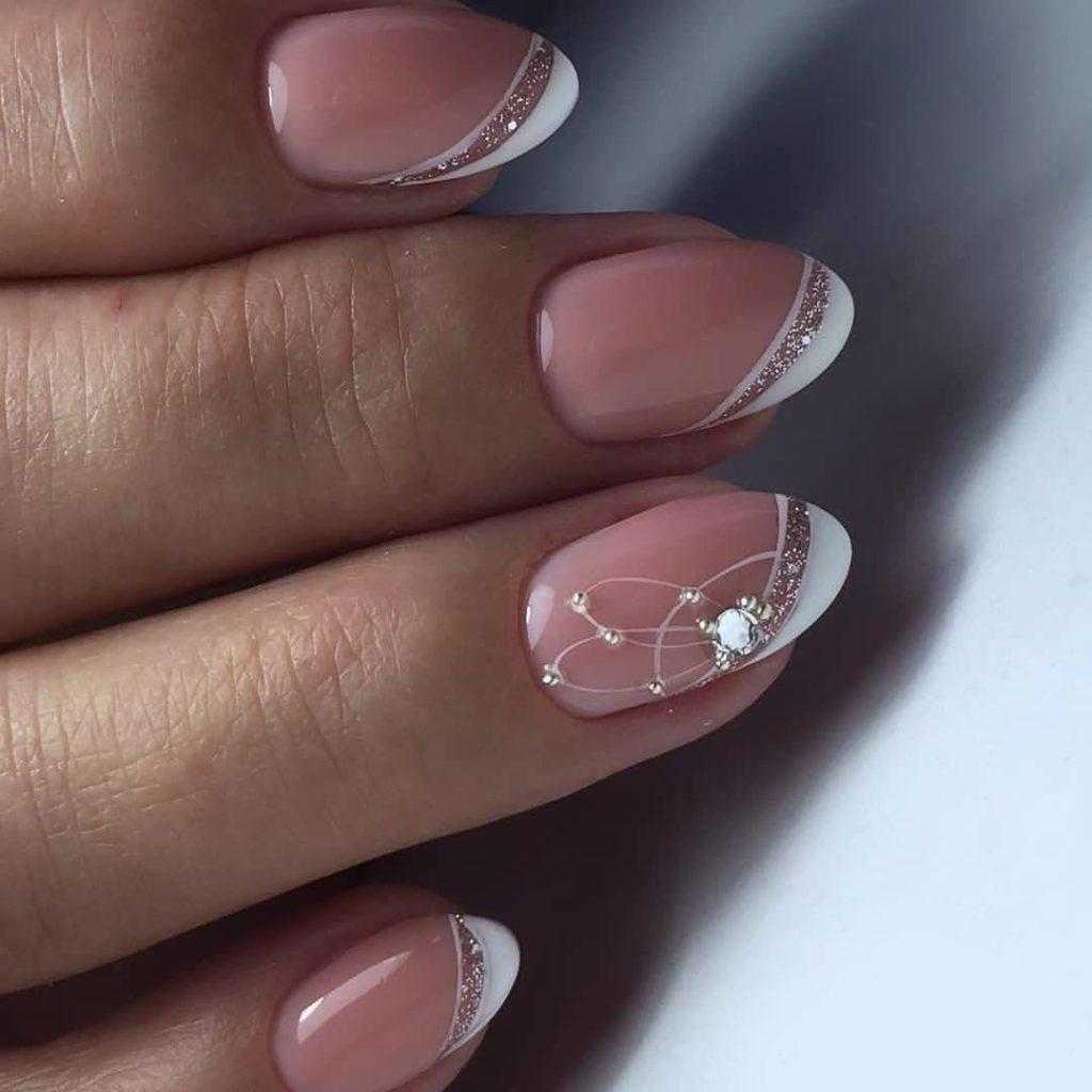 Белый цвет улыбки — это классика. Но это классика, не успела надоесть, и все еще не сдает своих позиций. База естественного оттенка и белый краешек пластины создают очень нежный, женственный и стильный образ. Такой маникюр можно дополнять стразами красивыми витиеватыми рисунками, наклейками, фольгой и другими элементами декора.