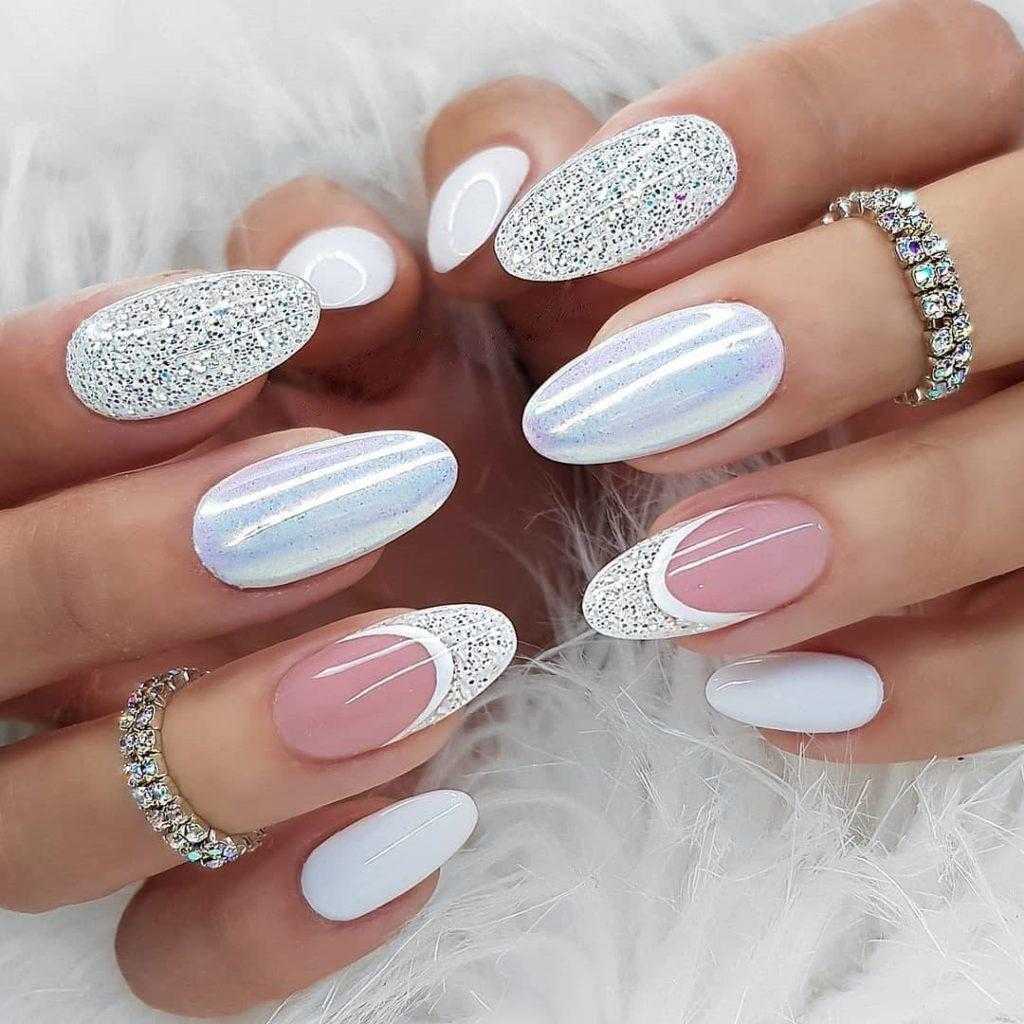Миллениум. Основа здесь обязательно должна быть прозрачной или светлой. На кончики наносят огромное количество блесток, перламутрового лака, пудры. Модель идеально подходит для вечеринок, выигрышно смотрится на длинных ноготках.