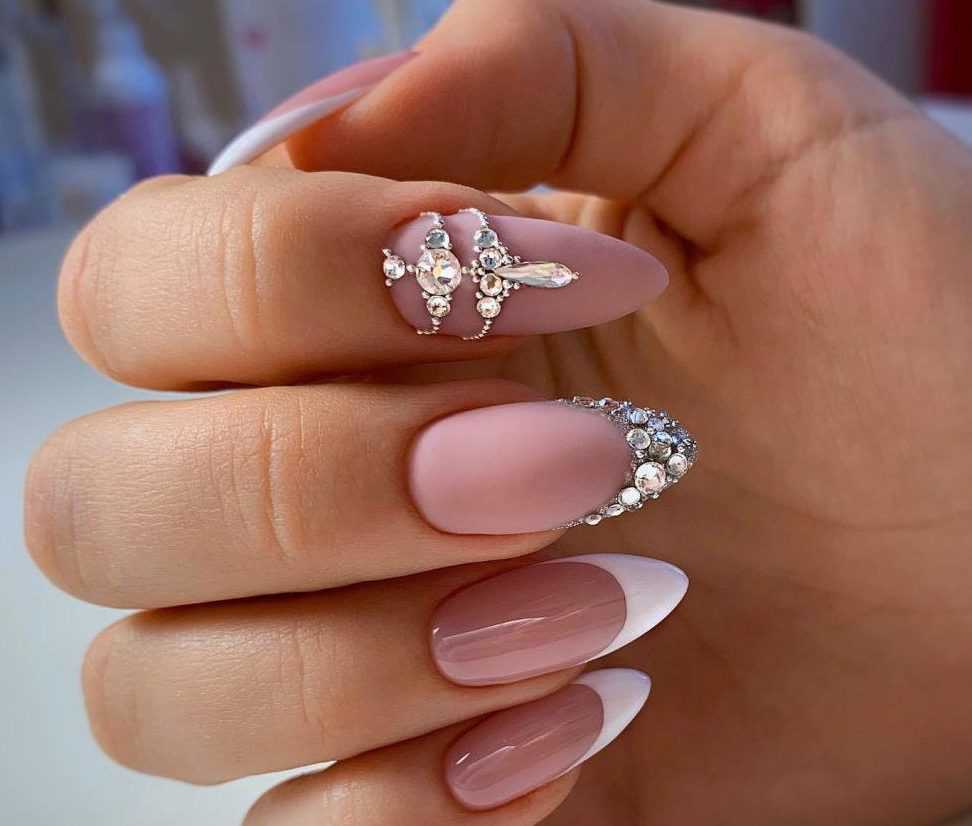 Такой маникюр подойдёт для совсем смелых модниц, ведь это — обилие страз, блёсток и прочих декорирующих материалов.
