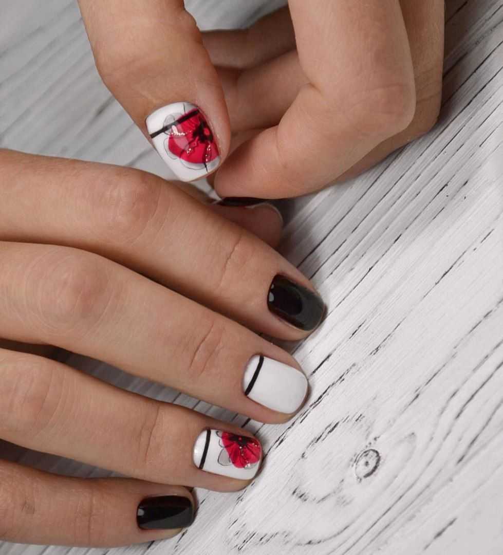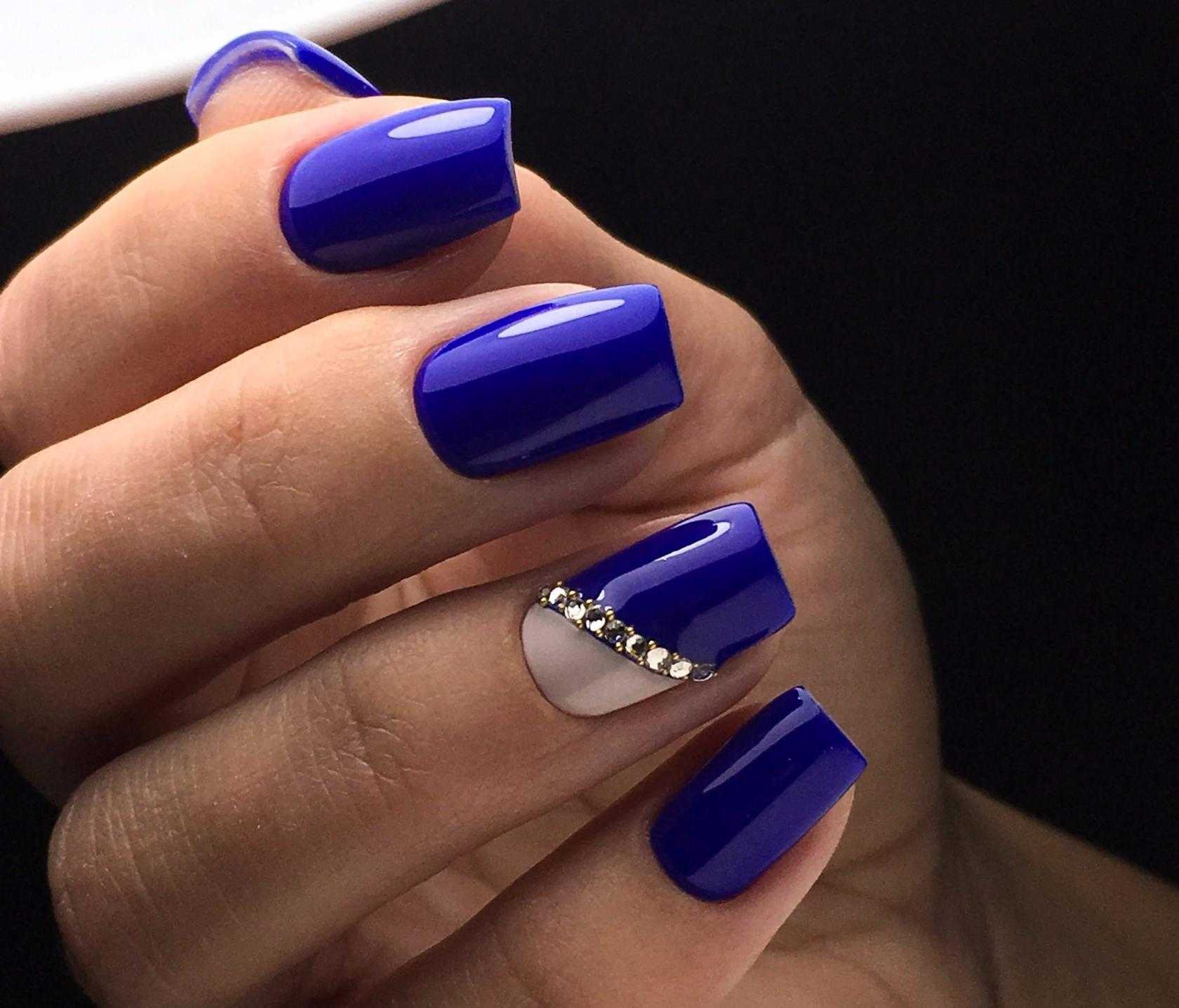 Сочетание синего и красного гель-лака в маникюре всегда привлекает внимание. Эти два активных и насыщенных цвета хорошо сочетаются между собой, и могут быть дополнены «нейтральными» белым и черным покрытием