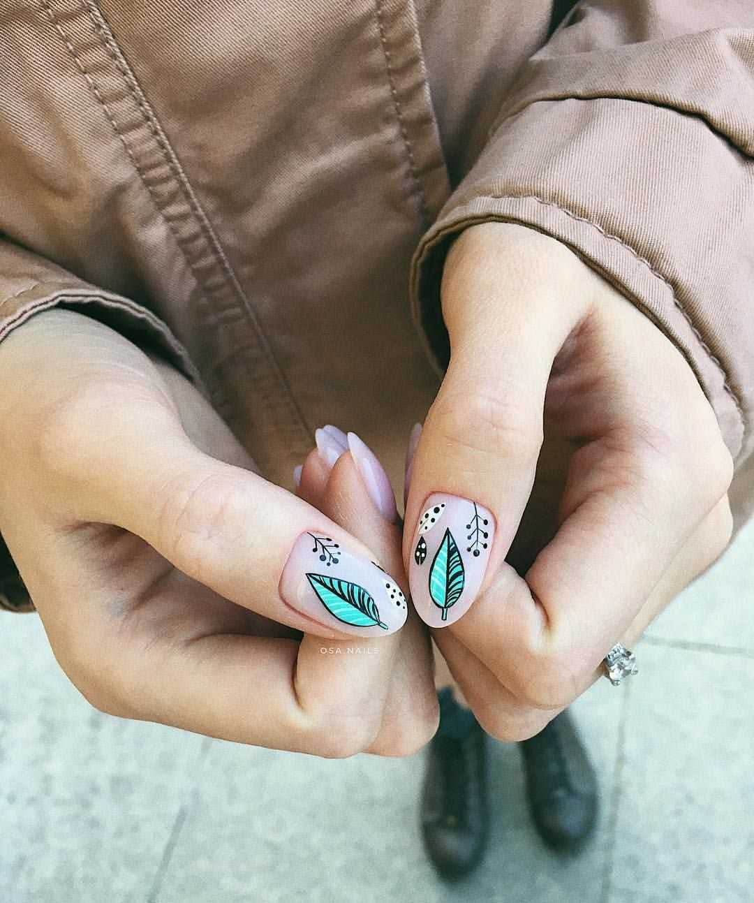 Обязательно попробуйте сделать самый модный маникюр 2020 года с тропическим принтом. Вариантов может быть несколько: сочетание зелени и геометрических форм черно-белого цвета, зелень и полоски, зелень и блестки или втирка, листва нарисованная на камуфляже.