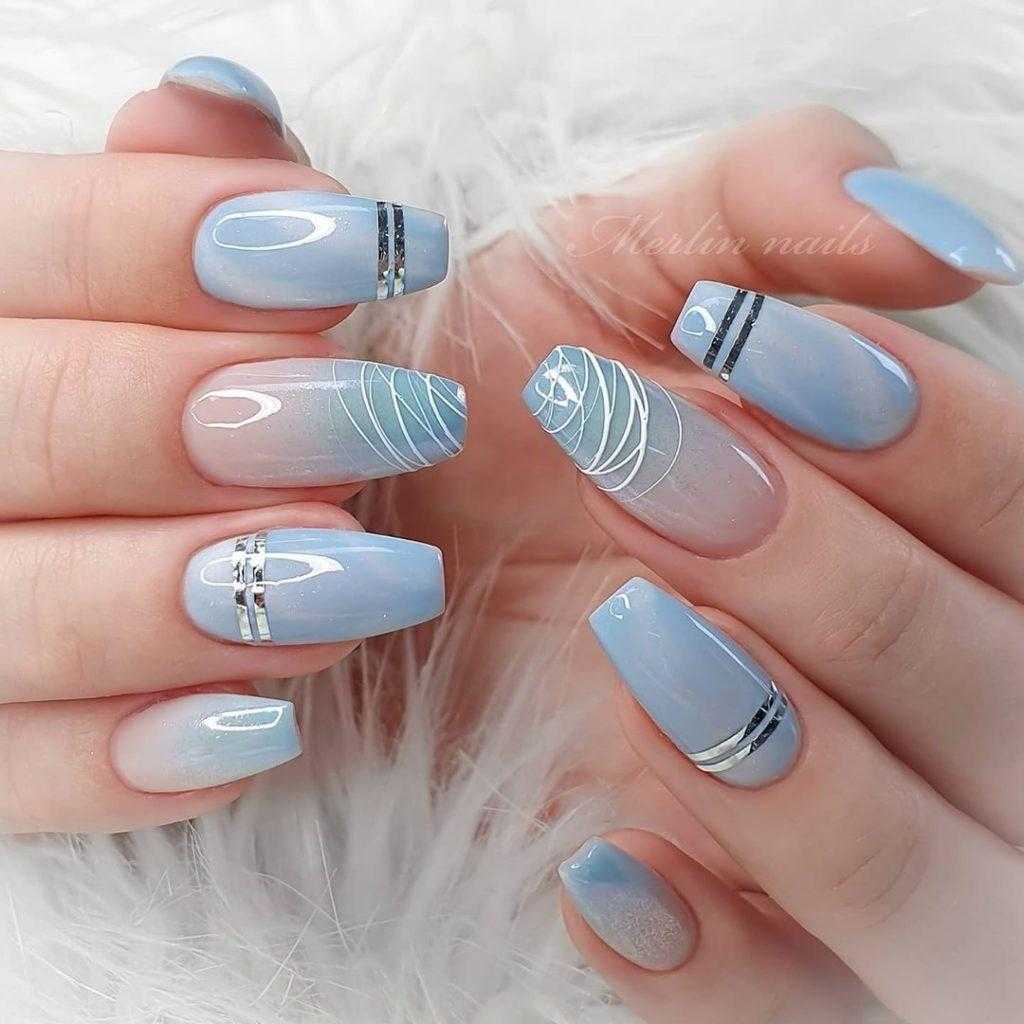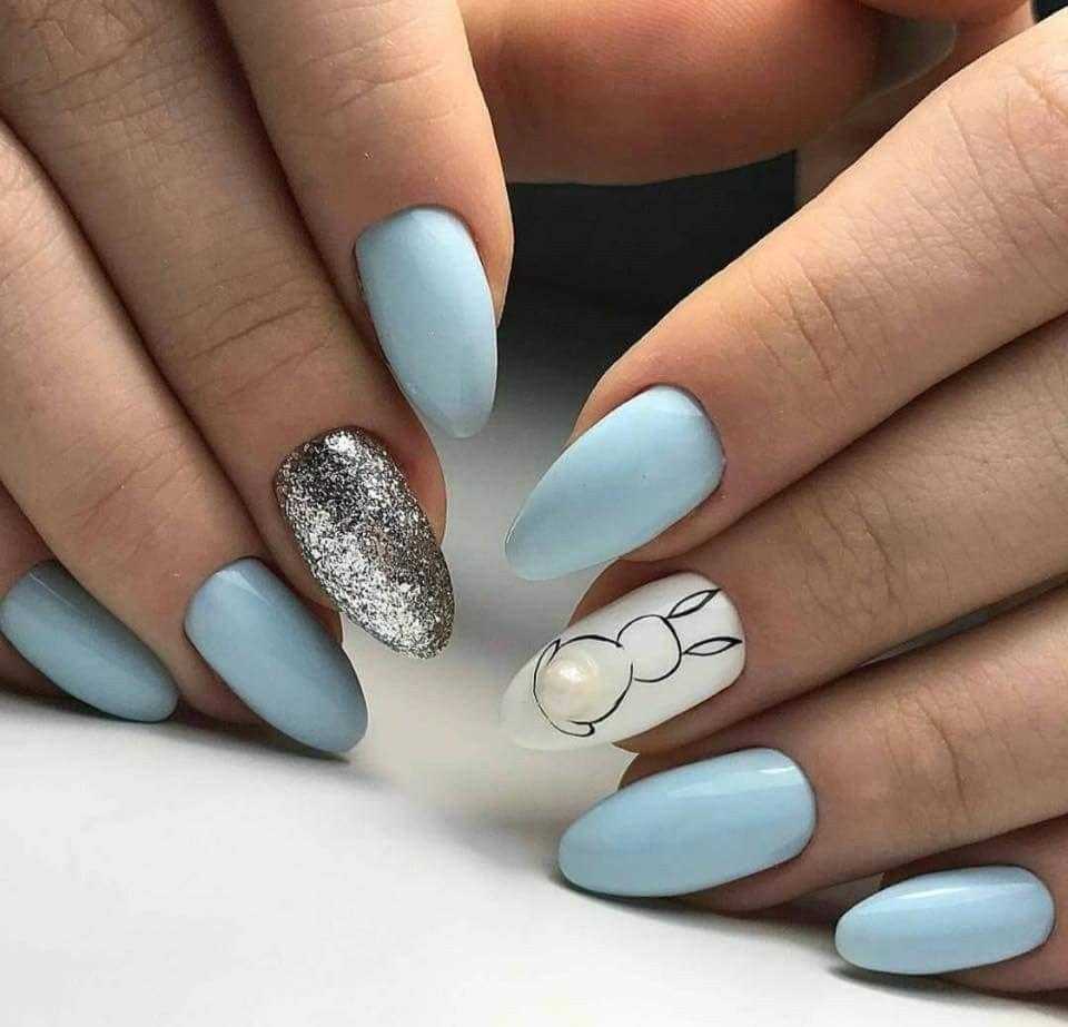 Вся раскладка палитры голубого цвета сегодня находится на пике моды. Бирюза, васильковый, небесный – поэтичные названия соответствуют красоте цвета на ногтях. Нежные пастельные оттенки голубого прекрасно играют с блестками в этой же палитре и украшают любой дизайн.