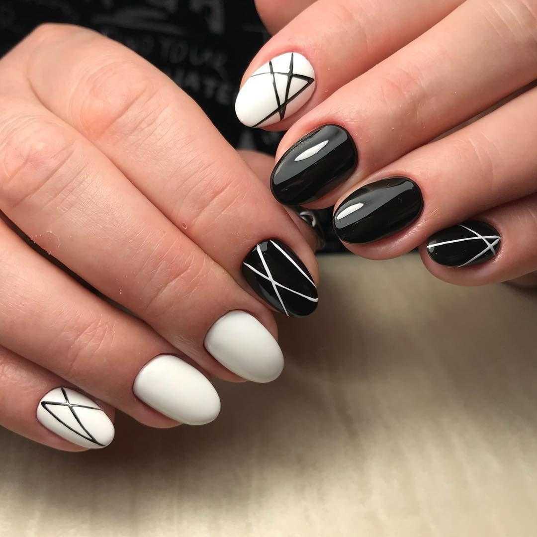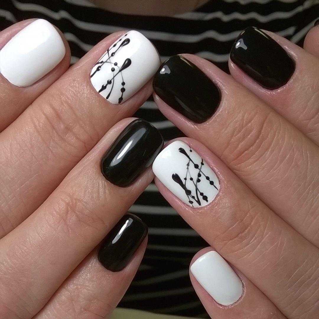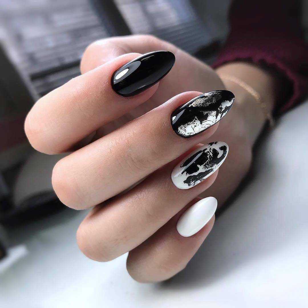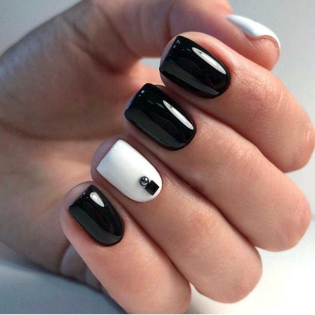 - Черный. Это оригинальное сочетание создаст контрастный маникюр. Его можно дополнить стразами, полосками и другими орнаментами.