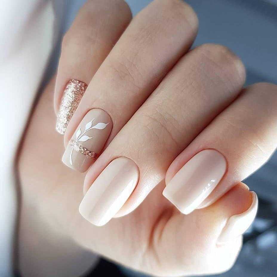 - бежевый. Чаще всего используются теплые тона лака с персиковым, оранжевым или коричневым подтоном. Такой маникюр выглядит максимально естественным и подходит для любой длины ногтей;