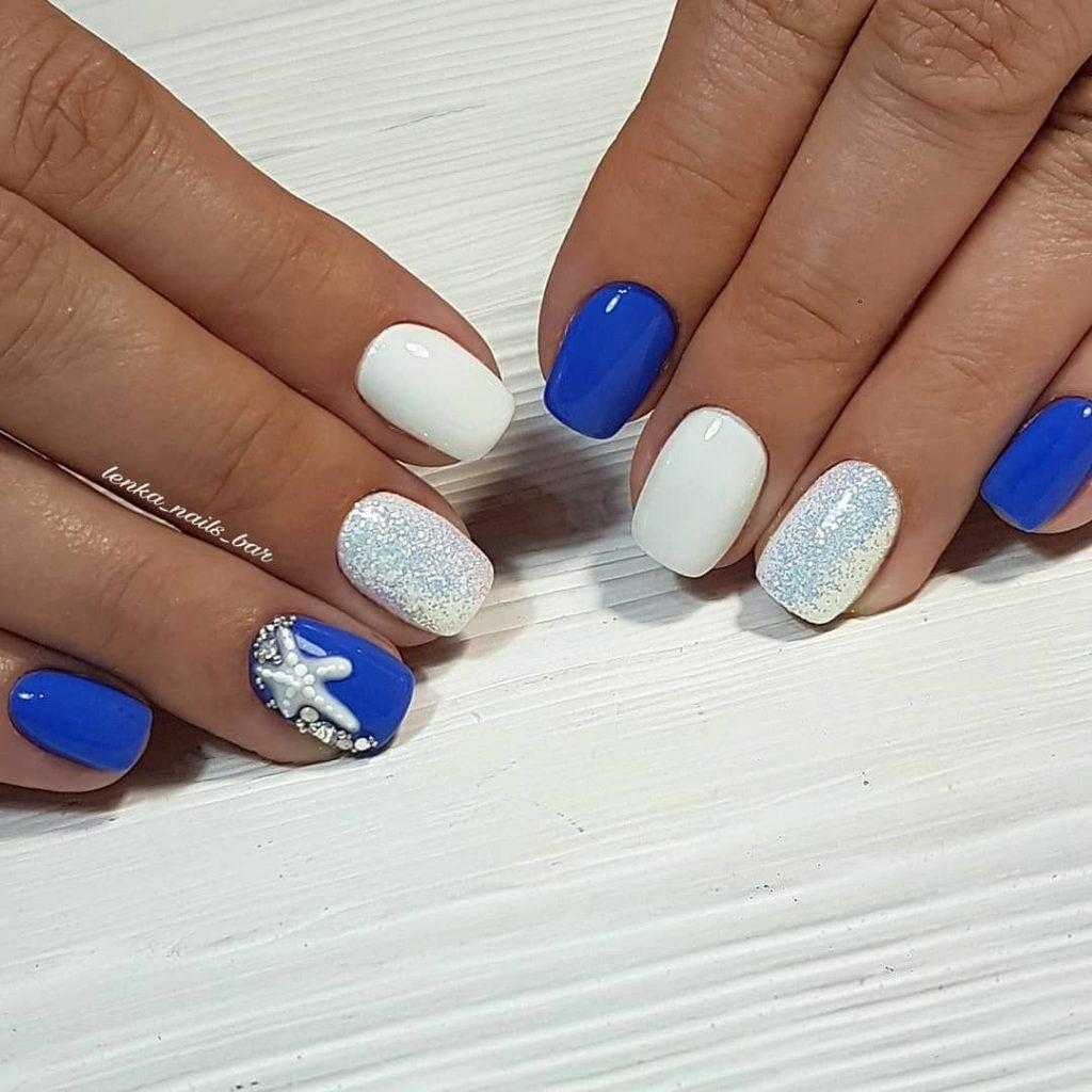 Если кто-то думает, что украшать ноготки блестками можно только на праздники, тот ошибается. Летом, в теплое время года тоже хочется сиять всевозможными переливами. Особенно красиво отражают блестки лучи яркого солнца. Блестящие ноготки в морском или круизном стиле так и манят навстречу приключениям и путешествиям.