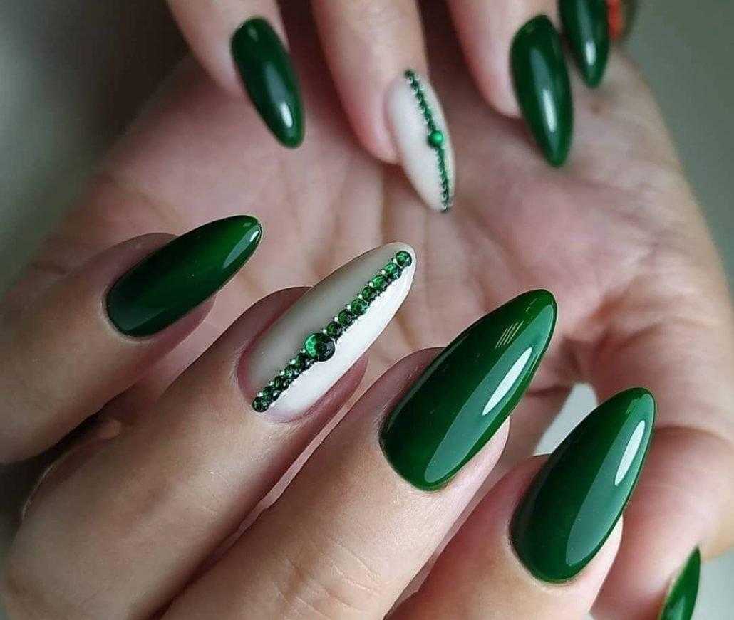 Красивый праздничный маникюр 2021-2022 невозможно представить без декоративных элементов. Белый жемчуг на алом или вишневом покрытии придает образу оттенок аристократизма. Популярный дизайн ногтей со стразами стильно представлен в красно-белом исполнении. На акцентные ноготки наносят стразы красного или белого цвета в зависимости от фона.