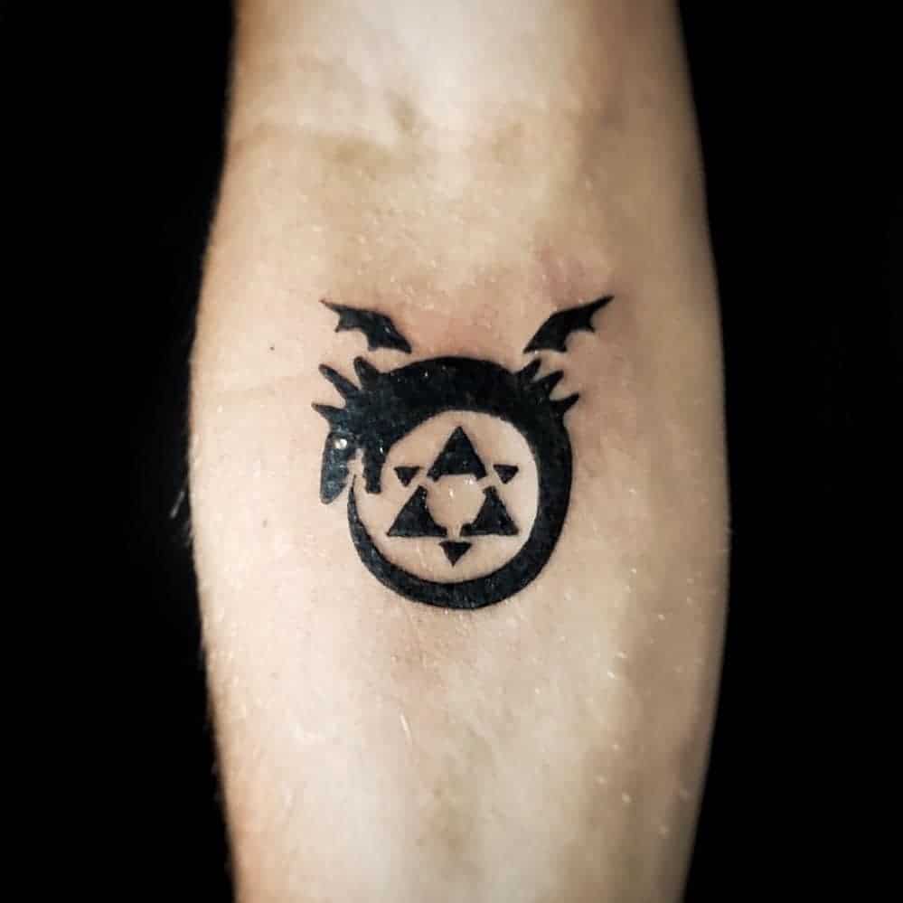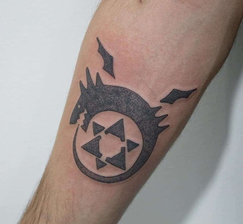 - Ouroboros: Depicting a serpent or dragon eating its tail, the Ouroboros is a symbol of eternity and the cycle of life, death, and rebirth. In Fullmetal Alchemist, it is the mark of the Homunculi, artificial human beings, each embodying a particular sin.