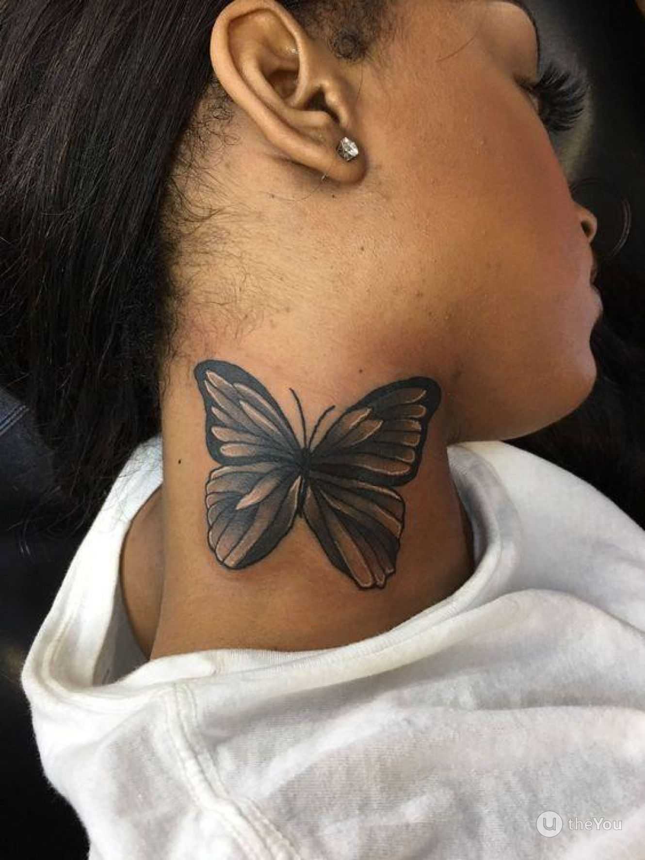 Татуировки в области шеи выбирают смелые, яркие люди, которые не боятся открыто демонстрировать собственные взгляды на жизнь и готовы до конца отстаивать свою точку зрения в споре. Также тату на шее символизирует открытость миру, желание познавать что-то новое. Бабочка на шее может изображаться в ярких красках или монохроме. Все зависит от настроения и личных предпочтений владельца.