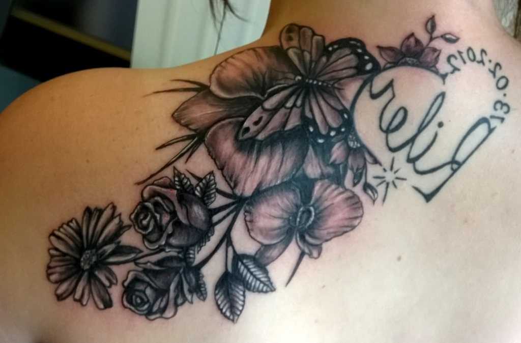 Изящное тату в виде цветов, которое затрагивает плечо, лопатку, шею