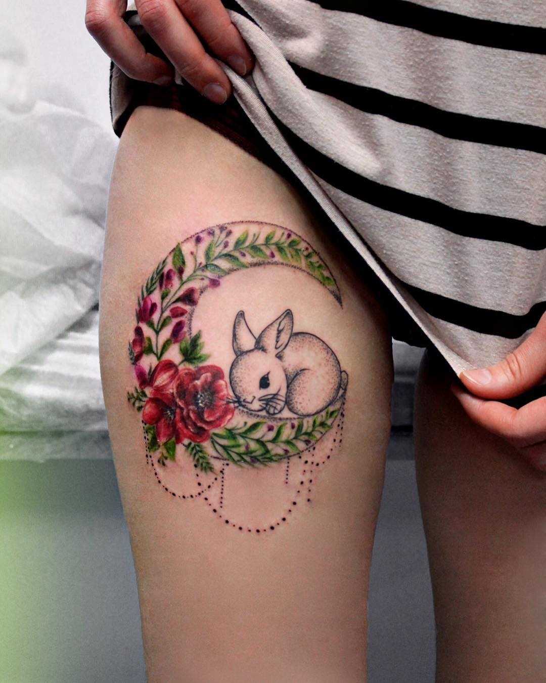1. Bunny and Moon: Symbolizing the connection between nature and the lunar cycle, a bunny sitting under a full moon creates a mystical and enchanting tattoo. This design can be rendered in various styles, from whimsical and dreamy to dark and mysterious.