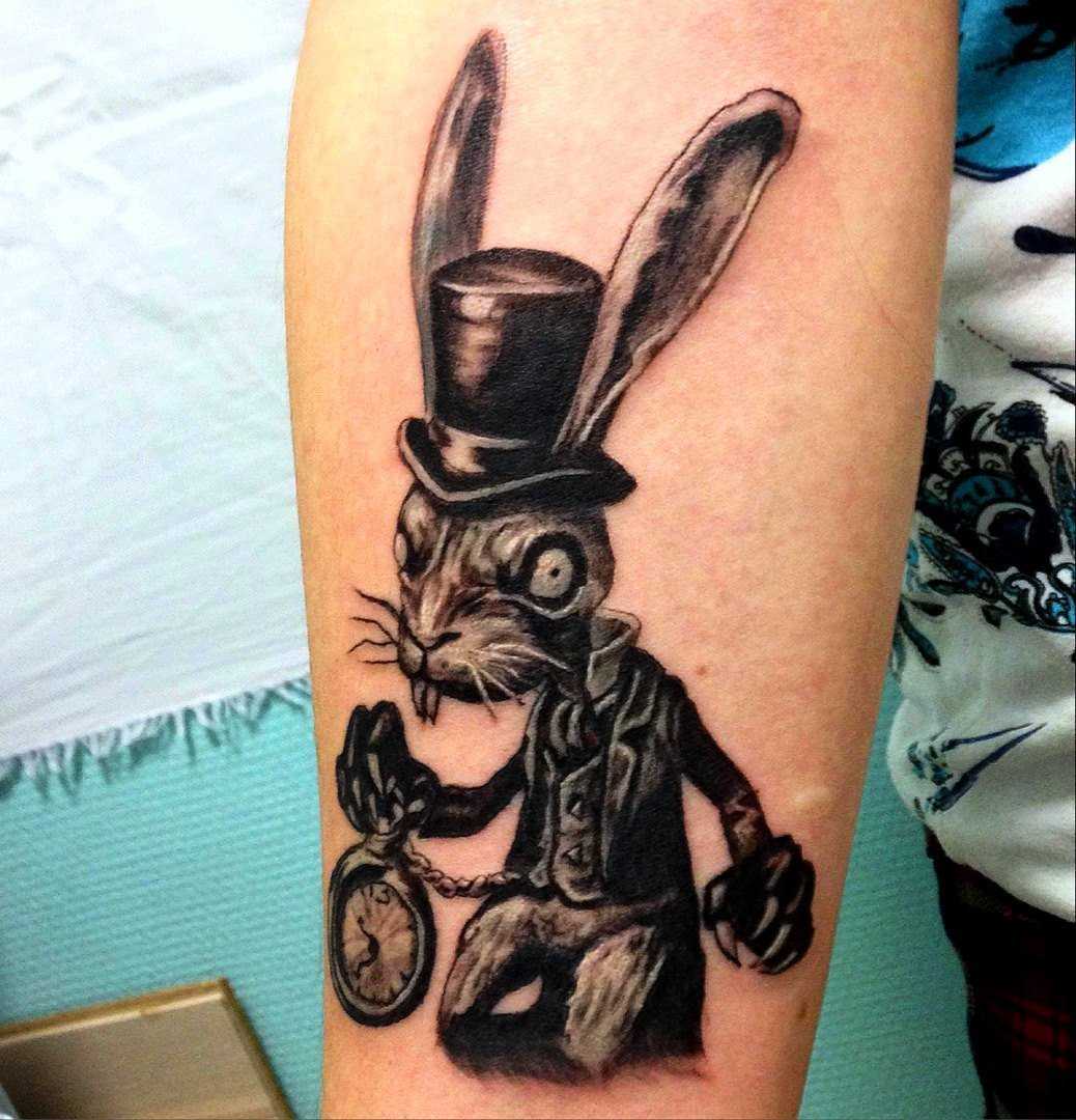 Well, this is truly a modern version of the bugs bunny tattoo, featuring bugs bunny in a completely different form. The usual carrot has been replaced with a half-smoked cigar whose smoke also covers up pretty much of the background. The tattoo artist does a perfect job in the smoke and cigar shades with fine inkwork. This tattoo almost acts as a parody to the “perfect image” of the Vitruvian man of Leonardo Da Vinci, or should we say the “Vitruvian bunny”! However so, this perfect image of a happy and healthy bunny has been broken down in this tattoo, probably representing with the passage of the century the turn of man and his fall. The Modern twist looks neat, and we do recommend inking this in colours.