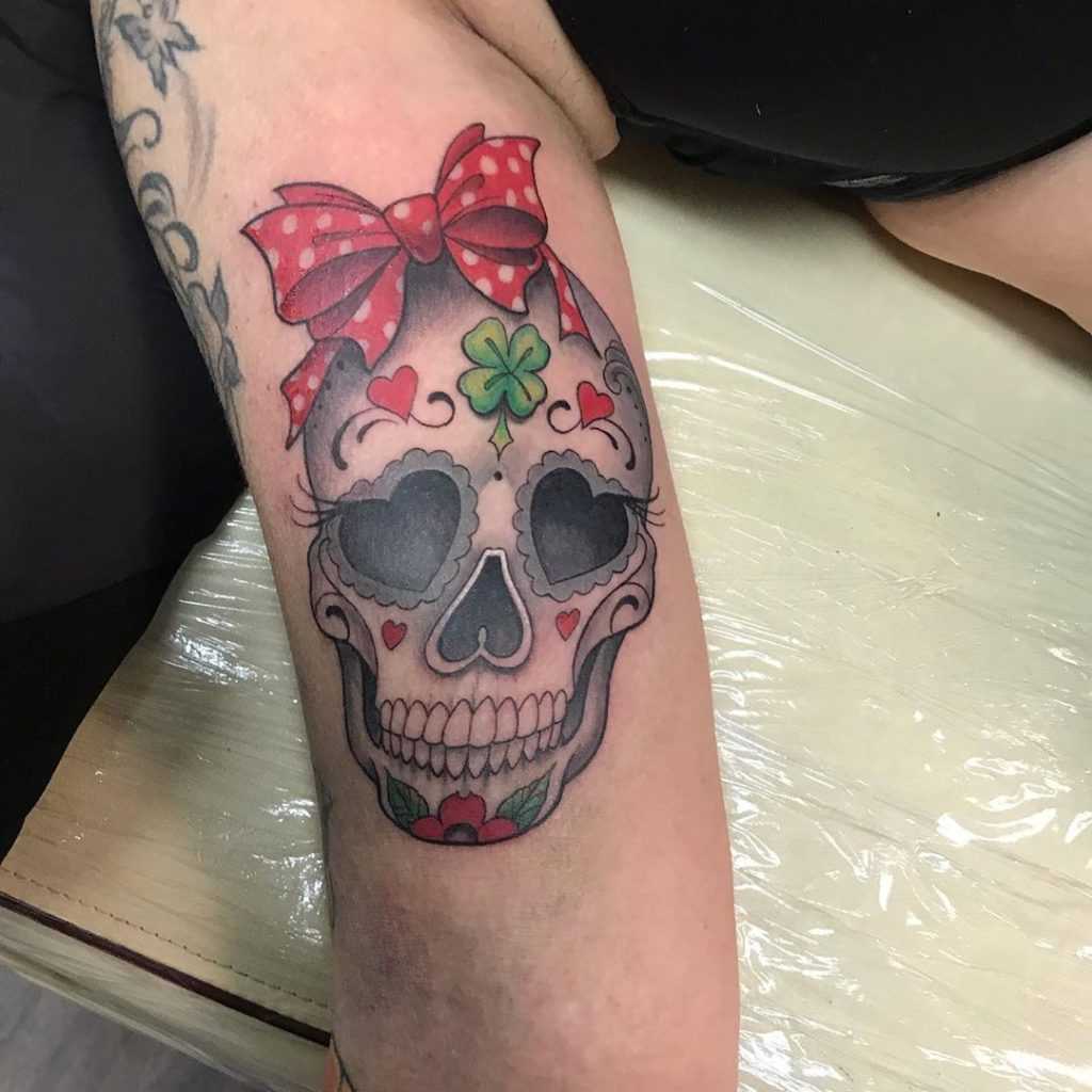 Нью-скул – яркая, кричащая палитра цветов, объемность, жирный контур, абстракция. Это микс банта с черепом и крестом. Отлично подойдет девушкам-бунтаркам.