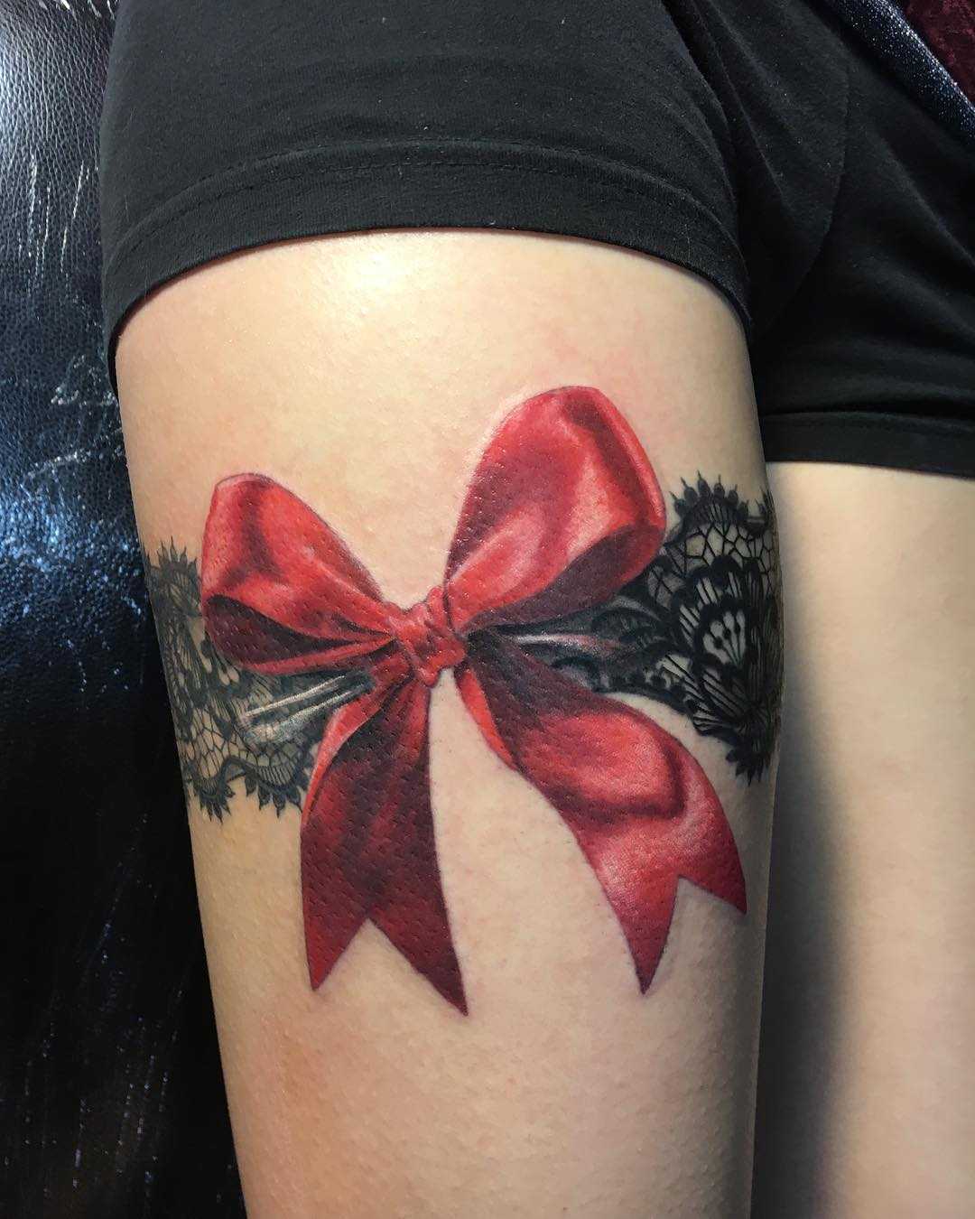 Удивительно, как обычная тканевая лента может придать романтичность даже самому простому платью и соблазнительность нижнему белью. Кстати, чаще всего среди татуировок встречается кружевной бантик, который у большинства ассоциируется именно с нижним бельем. Такие работы обычно делают на местах, большую часть времени скрывающихся под одеждой, что только добавляет образу их обладательниц пикантности.