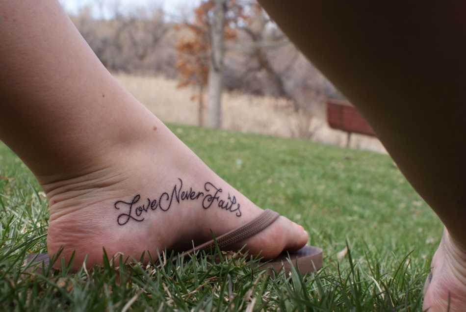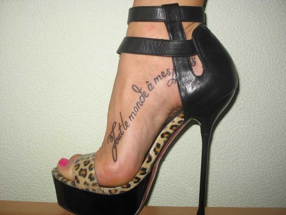 Надпись вдоль стопы в виде тату отлично смотрится в сочетании с обувью на каблуках