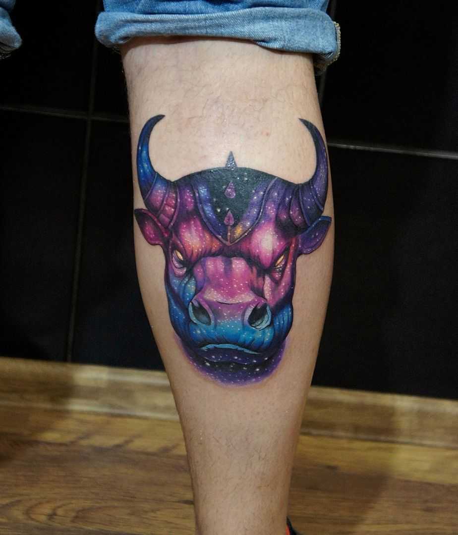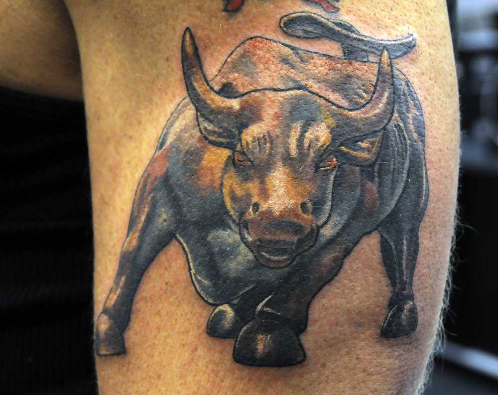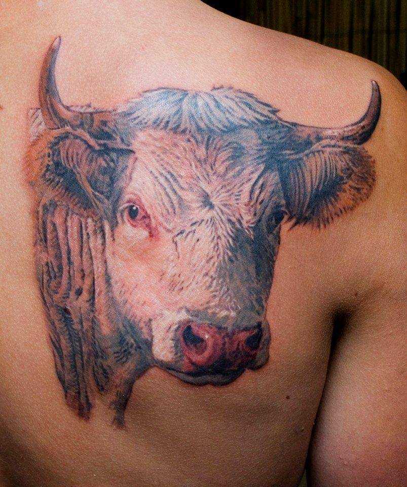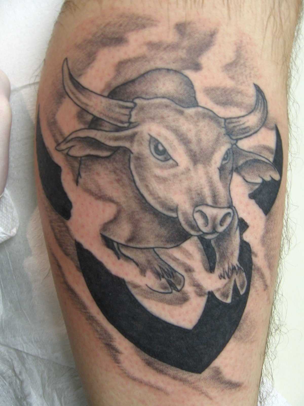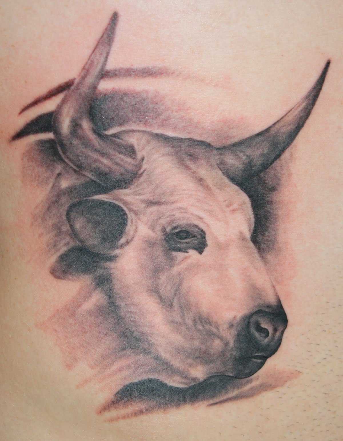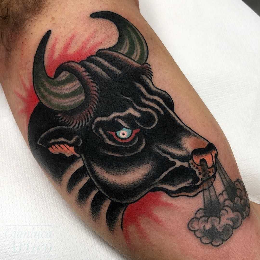 В тоже время есть черный бык, символизирующий огненное начало, демоническую силу и смерть. В зодиакальном значении бык – это телец, благодаря этому его изображение почасту применяют люди, родившиеся под этим знаком, веря в то, что он придаст им сил. В сегодняшнем мире татуировка с рисунком быка имеет фактически тоже значение, что и прежде. Бык – это упорная и пускай порой, но несмышленая сила, сексуальность, мощь и мужественность, плодовитость, что считается отличительным для любого настоящего мужчины. Черный или очень темный бык – символ темных сил и игры с гибелью, очень часто изображается с горящими глазами. Бык с корриды – мужское и звериное начало, которые были укрощены.