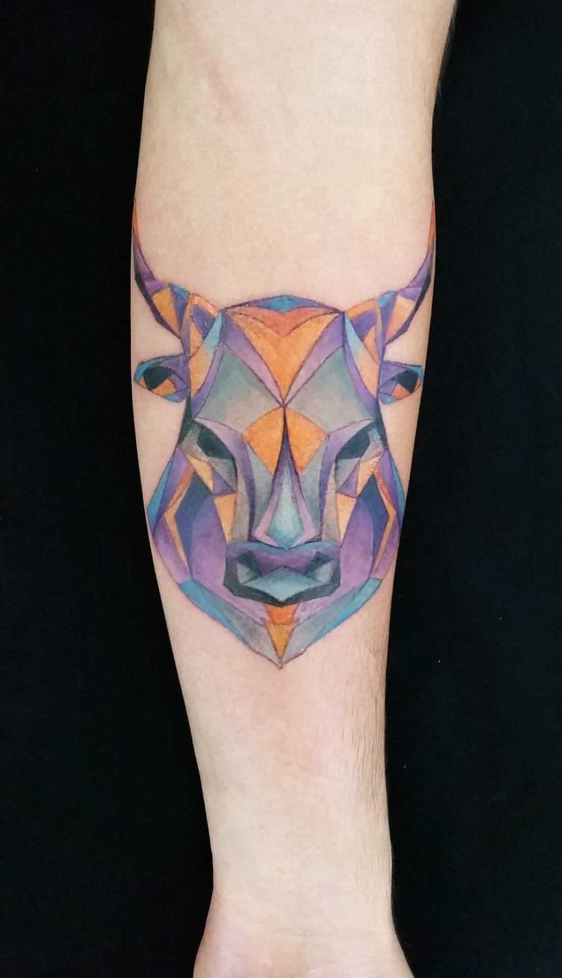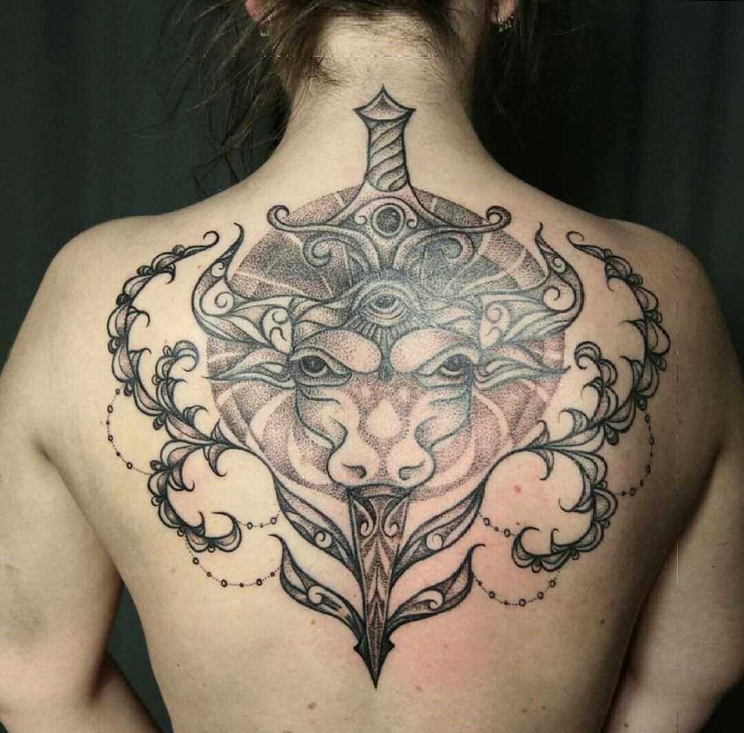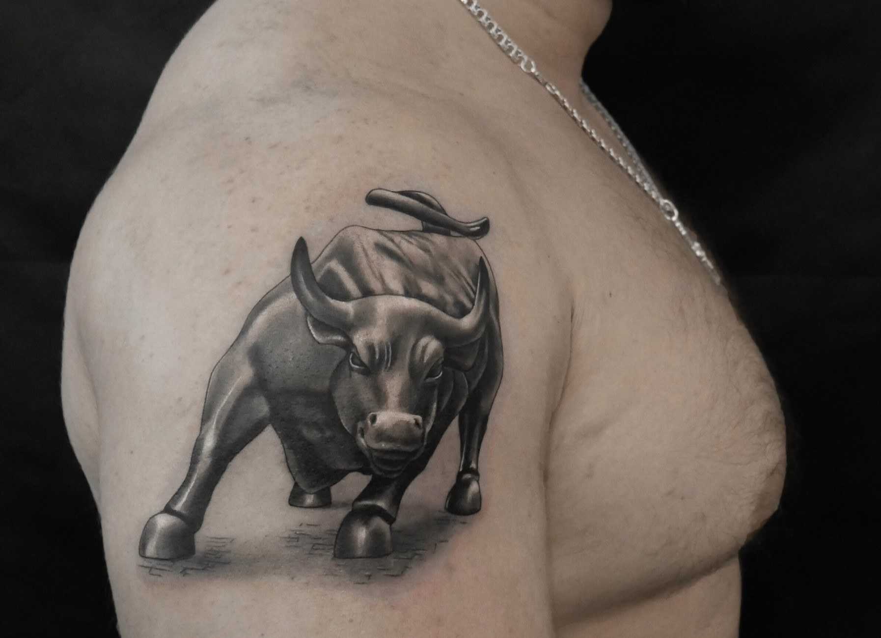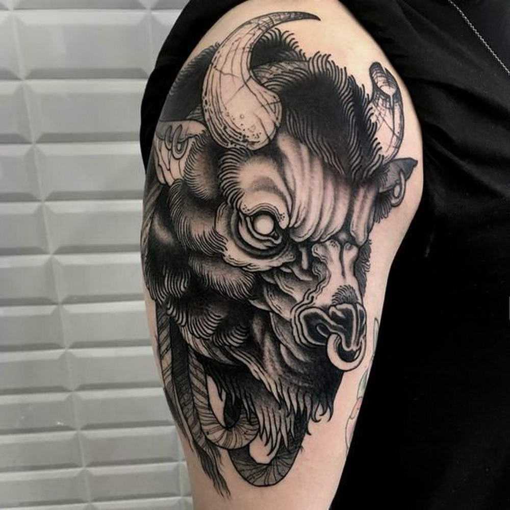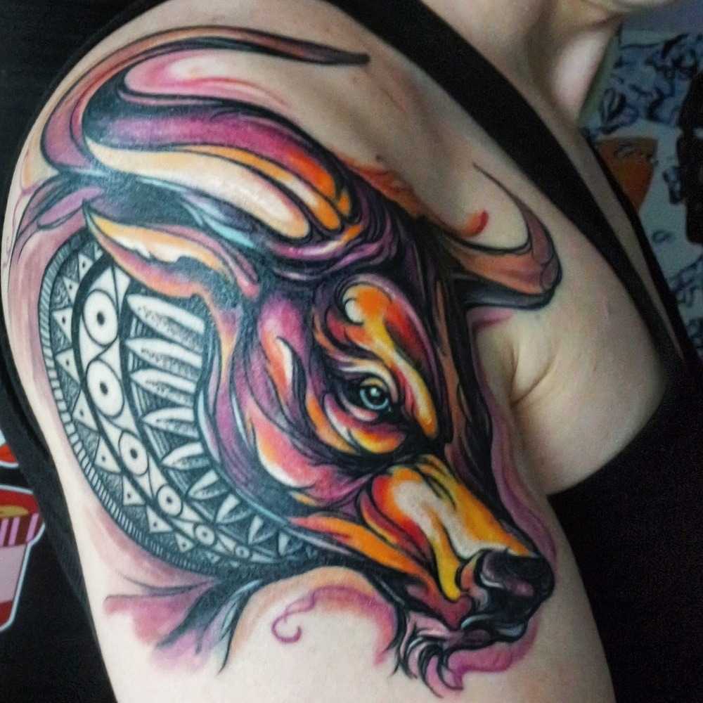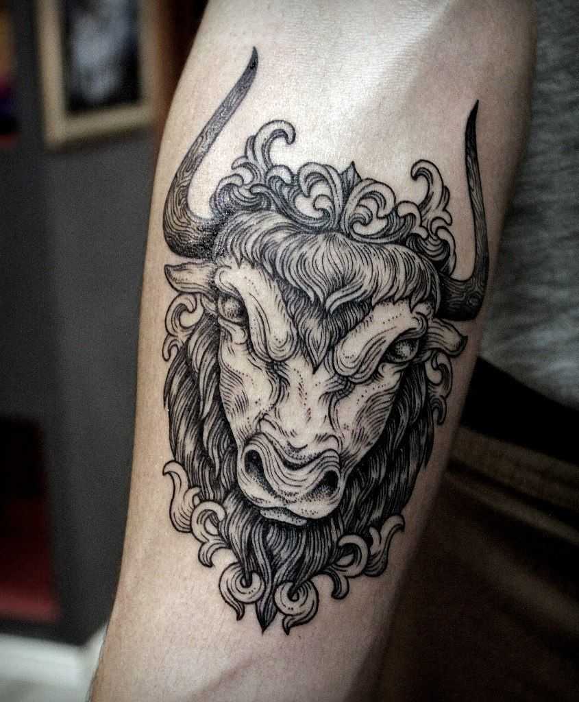 В тоже время есть черный бык, символизирующий огненное начало, демоническую силу и смерть. В зодиакальном значении бык – это телец, благодаря этому его изображение почасту применяют люди, родившиеся под этим знаком, веря в то, что он придаст им сил. В сегодняшнем мире татуировка с рисунком быка имеет фактически тоже значение, что и прежде. Бык – это упорная и пускай порой, но несмышленая сила, сексуальность, мощь и мужественность, плодовитость, что считается отличительным для любого настоящего мужчины. Черный или очень темный бык – символ темных сил и игры с гибелью, очень часто изображается с горящими глазами. Бык с корриды – мужское и звериное начало, которые были укрощены.