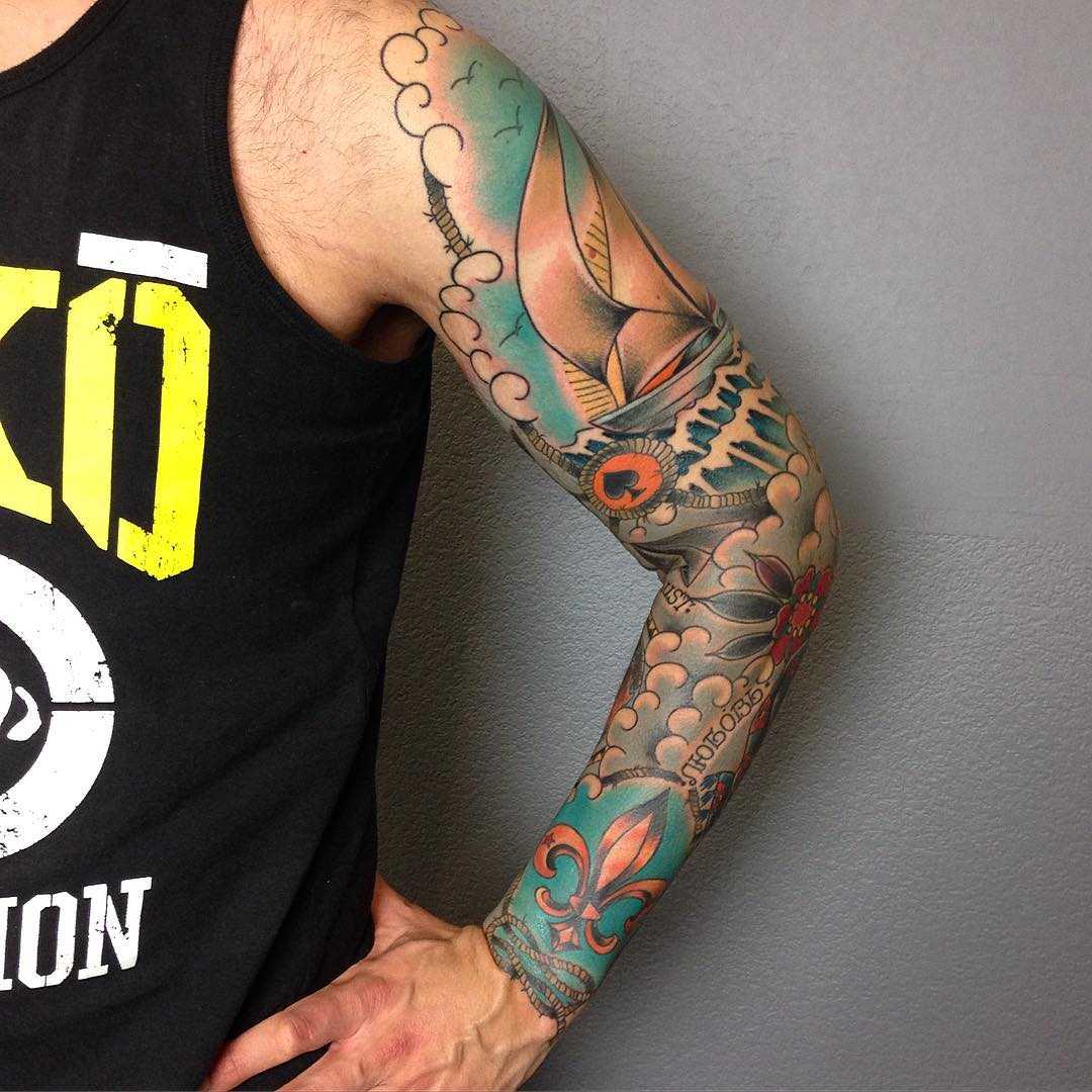Татуировка рукава: изображения мужского тела, которые покрывают почти всю область руки. Такая татуировка может представлять собой законченное изображение или состоять из отдельных частей. Также популярны татуировки на запястье, которые никогда не являются первыми, а лишь дополняют уже существующий тату-состав. Самый популярный вариант мужских татуировок на запястье — татуировка браслет. Также часто можно увидеть на запястье мужчин изображение ботанических растений, таких как роза, листья папоротника или дерево.