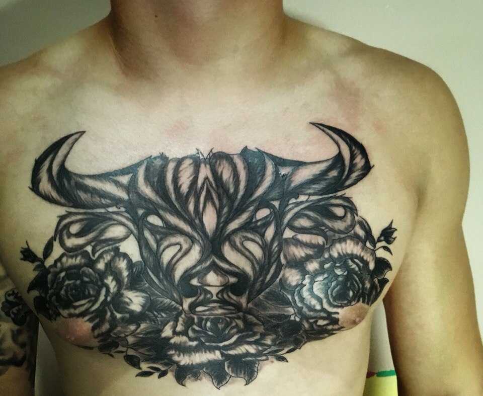 Так как бык является символом силы и мужественности, то чаще всего мужчины хотят сделать татуировку большого размера. Для этого лучше всего подойдет спина или грудь. Ведь на таком пространстве гораздо проще реализовать задумку и тщательно проработать все детали.