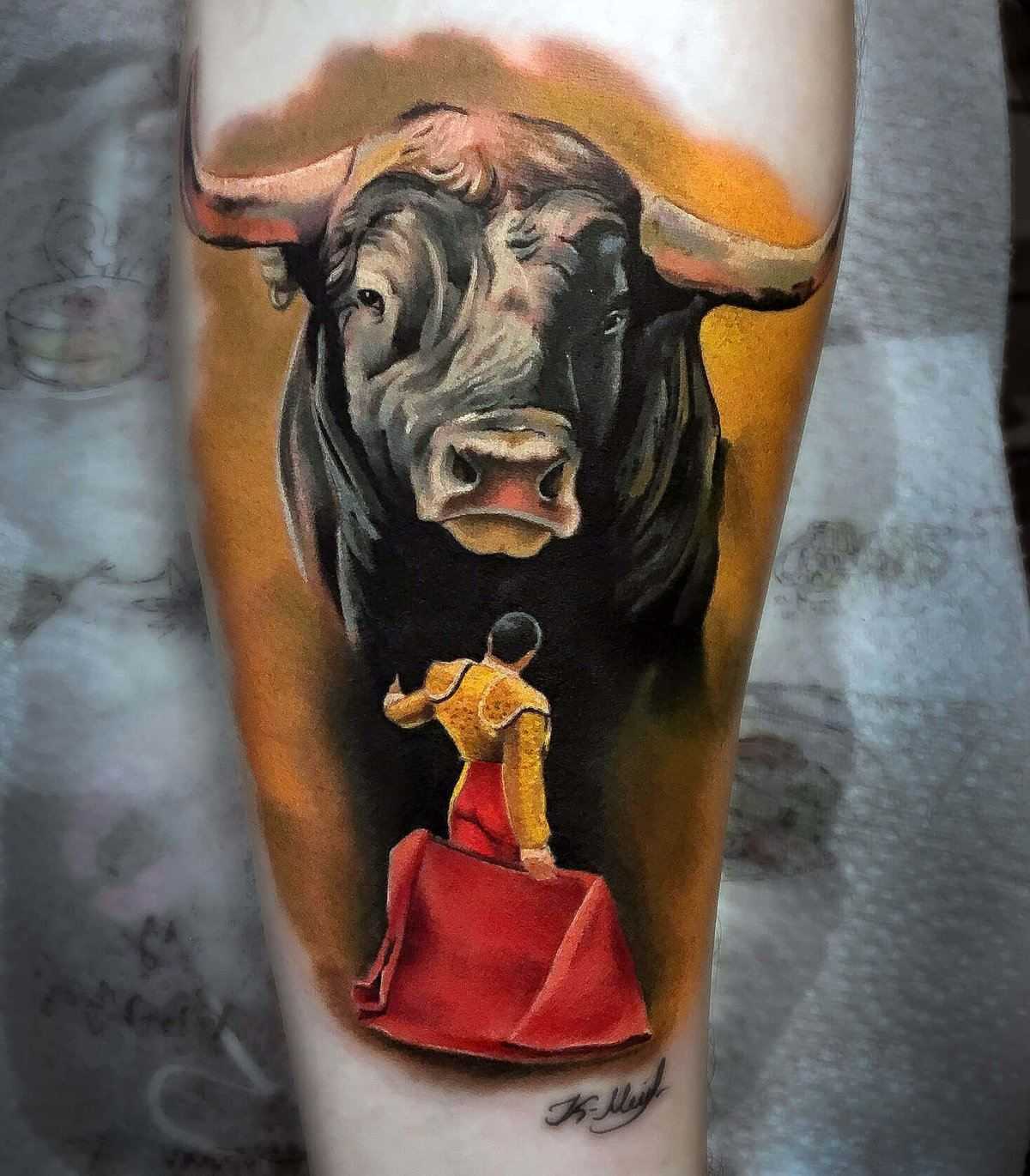 Бык на корриде является оседланным быком. Поэтому значение такой татуировки простое и понятное – укрощение мужского и звериного начала. Не менее популярным считается изображение человека с головой быка. Тату является особым оберегом от нечистых сил и придает ее обладателю жизненную энергию, стремление к достижениям.