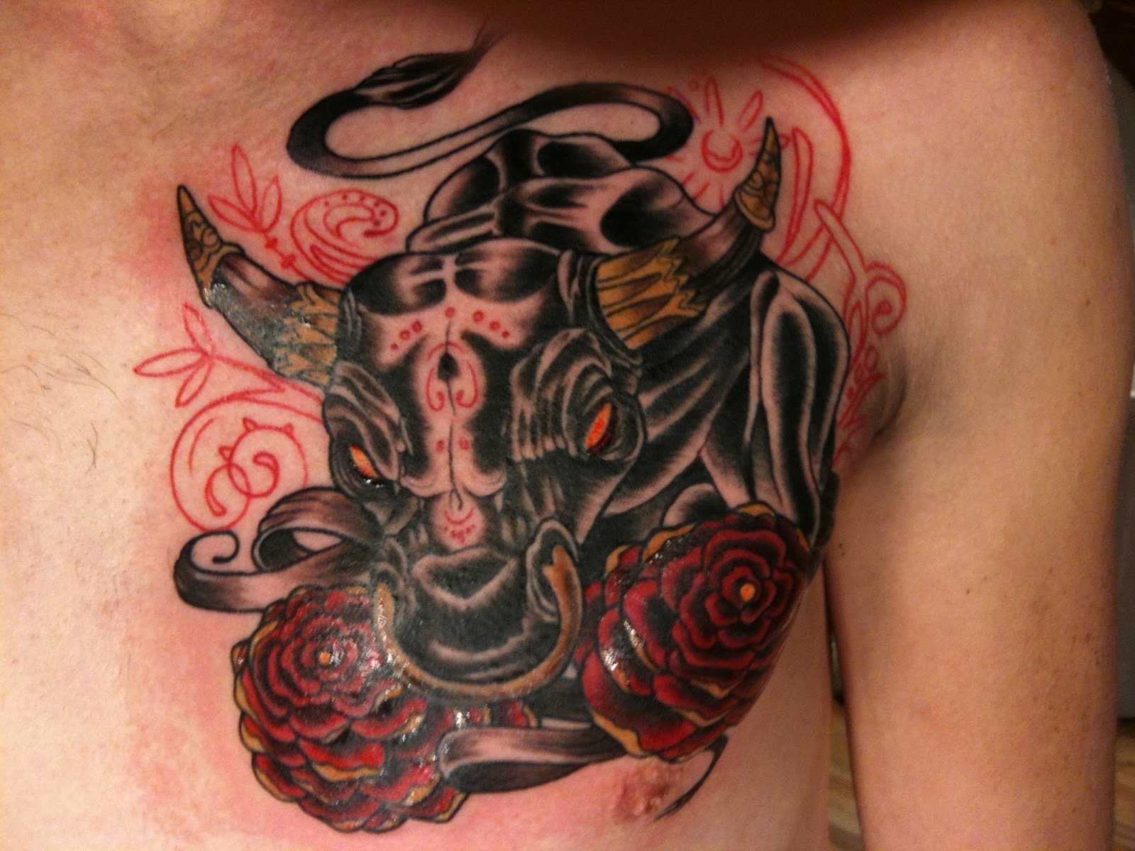 Не менее распространенный вариант татуировки – человек с бычьей головой – символ страха, охраняющего человека и его душу от свирепых сил и духов. Считается, что тату бык способно стать оберегом, талисманом для собственного владельца, оберегая его от нечистых сил. При этом татуировка способна презентовать владельцу энергию жизни и силу, его сделать более напористым для того, чтобы он смог достигать заданных целей.
