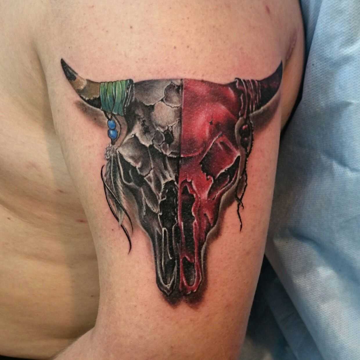 В татуировке может присутствовать череп буйвола (см. Татуировки черепа).