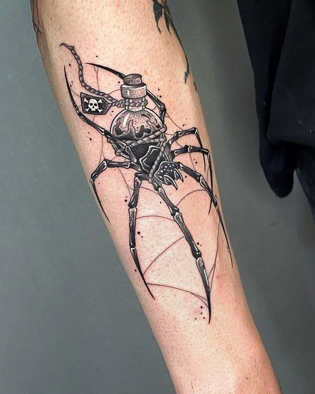 Spider tattoos have deep and rich meanings. First of all, a spider tattoo represents manifestation. One of the miraculous features of this creature is the spider web. The web can be associated with shaping a destiny. Also, if the web is destroyed for any reason, spiders will weave it again. This action is a reminder of struggle, personal strength, and self-belief for people.