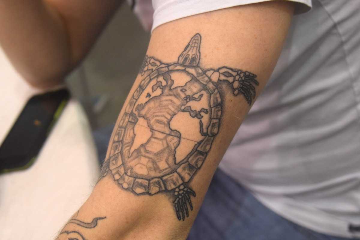 Очевидно напоминание о том, о чем мы говорили раньше, в некоторых культурах, которые верят, что великая черепаха несет мир в своем панцире., хотя и в более реалистичном и оригинальном исполнении. Кто знает, может быть, человек с татуировкой думает, что мир плывет по течению и что рано или поздно миру придет конец … В любом случае, это отличный пример того, как добиться очень оригинального и уникального дизайна. .