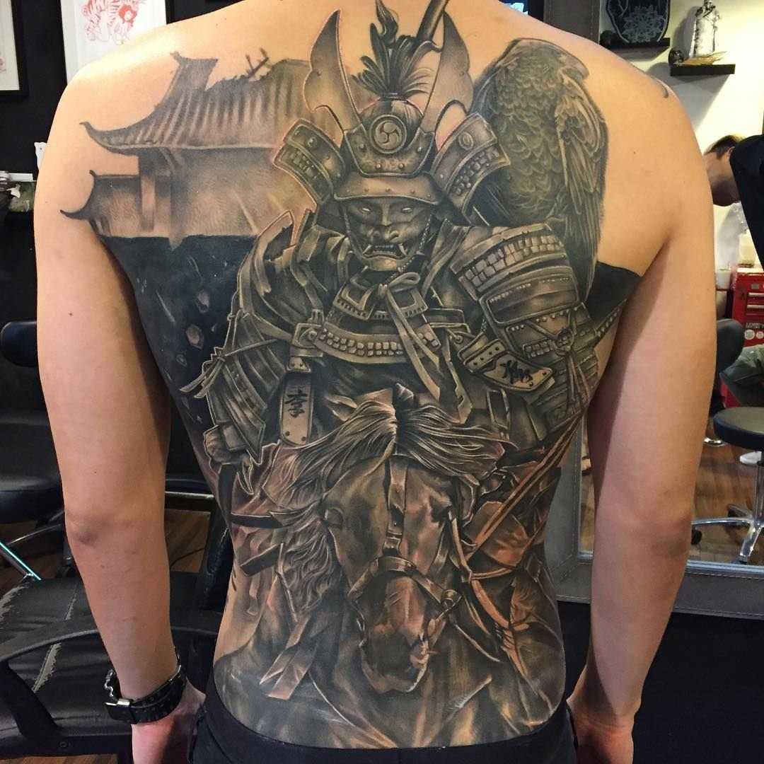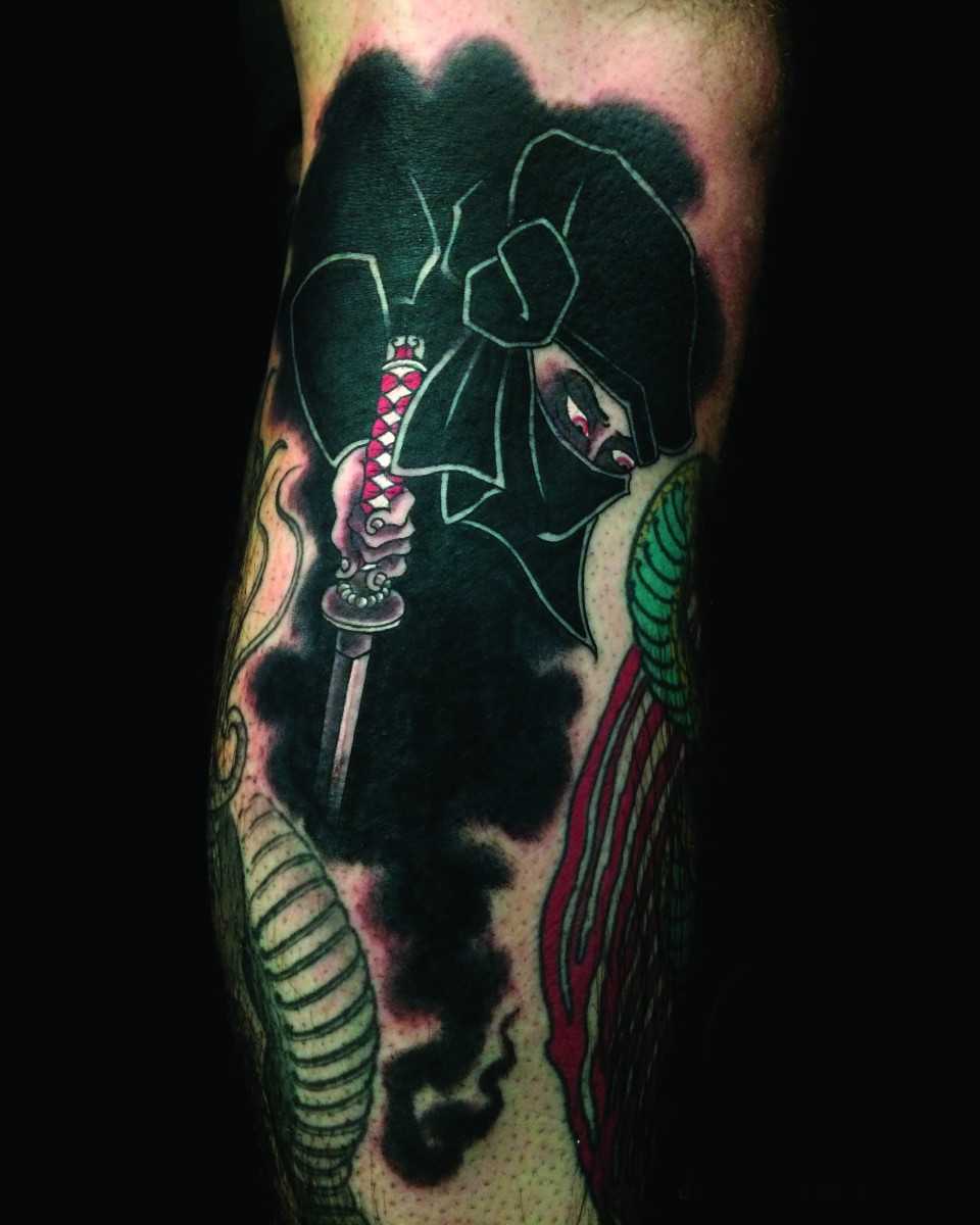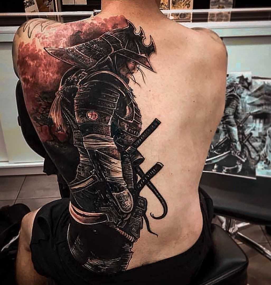 Изображение ниндзя либо самурая, подчеркивает, что владелец такой тату почитает обычаи предшествующих поколений, обладает мужеством и стойкостью, сражается за высокую нравственность, неуклонно идет своей дорогой, не отклоняясь от целей. Кроме того эта татуировка означает великодушие, избрание верного пути, верность идеалам и высшим целям. Ниндзя или самурай характеризует обладателя татуировки как человека чести, с четкими жизненными целями и приоритетами имеющие высокую мораль и твердость духа.